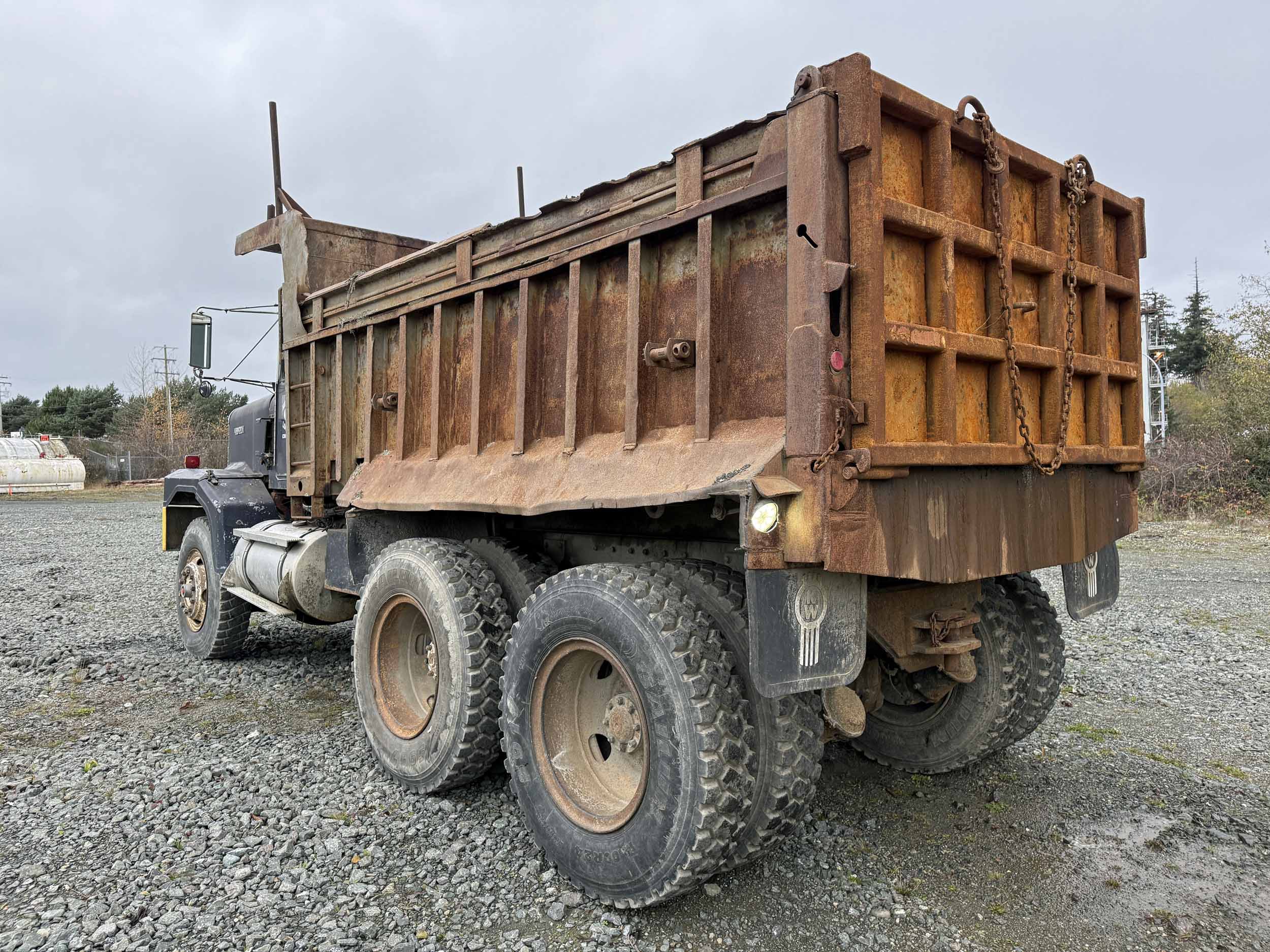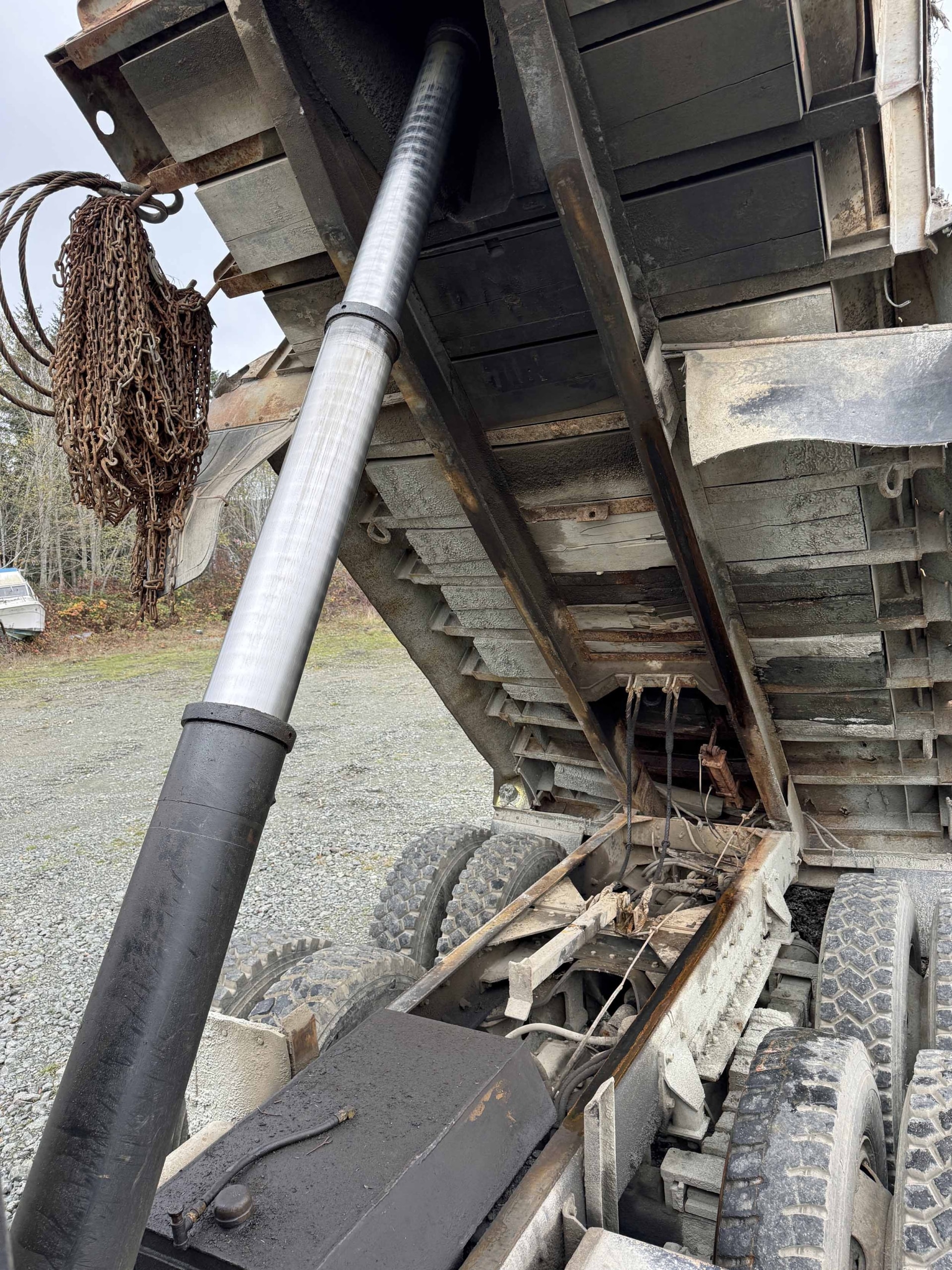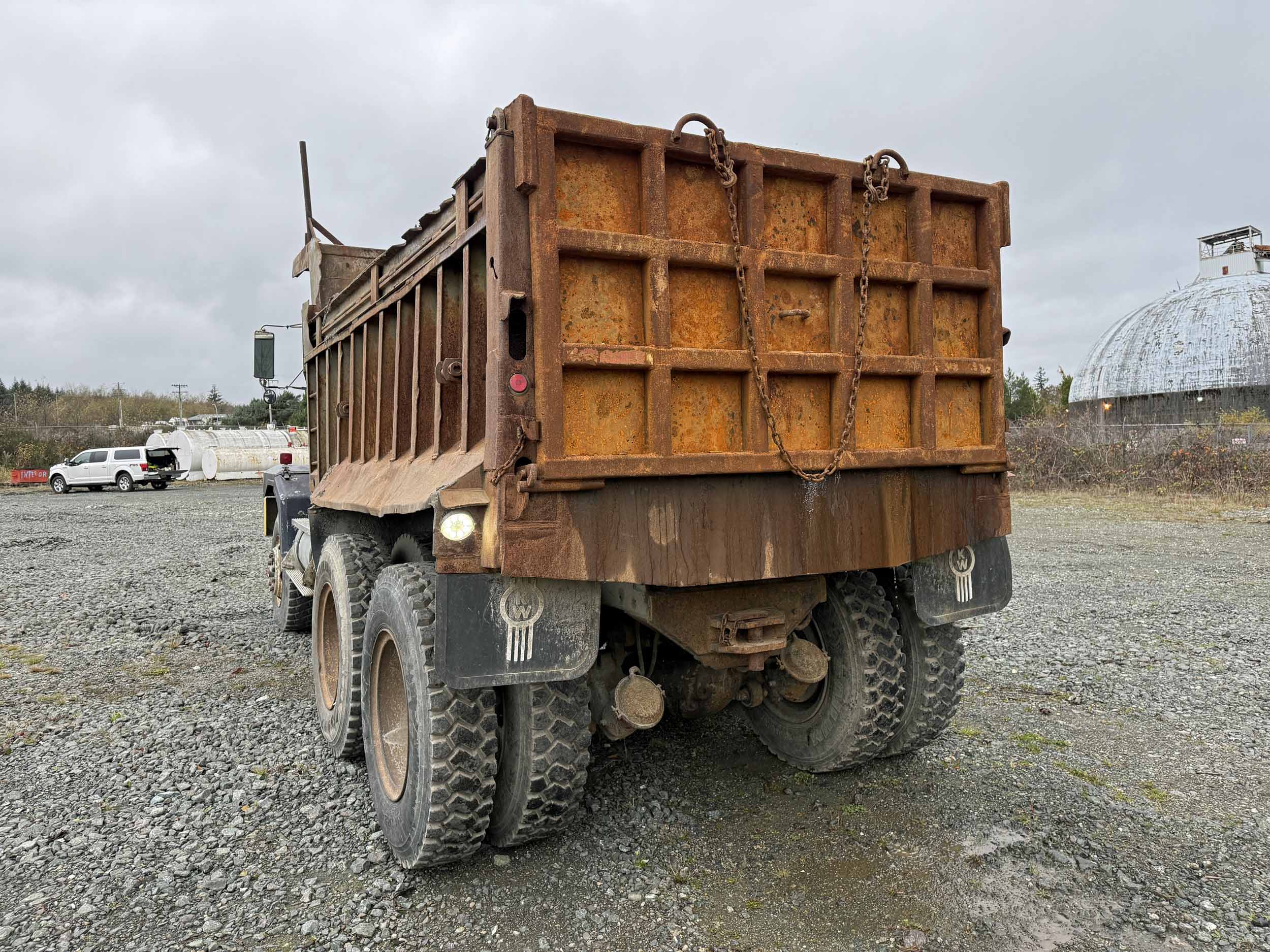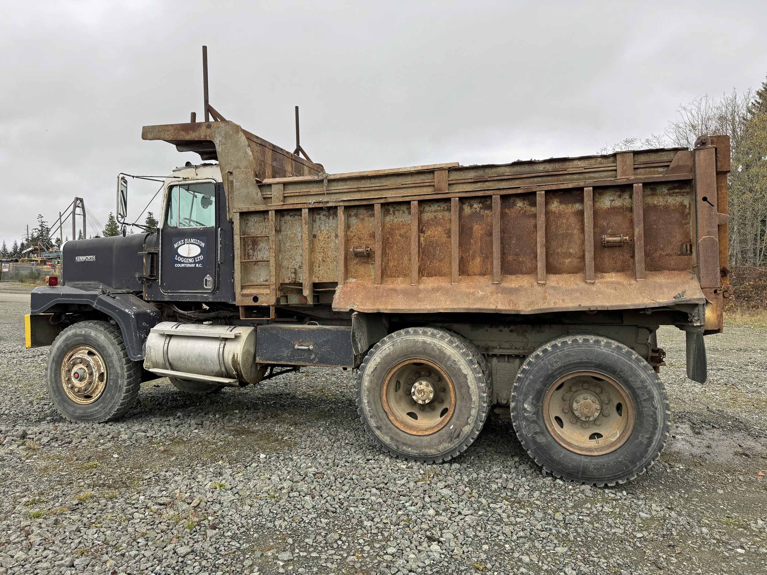 Equipped with Cummins NTC350BCII six cylinder diesel engine, 13 speed transmission, Jake brake, Kenwood VHF radio, Nahanni HD steel HD dump box with tailgate and single cylinder hoist, spring suspension, 4640 rear axles, Bud wheels, Sailun 12:00R24 tires, rear pintle hitch.