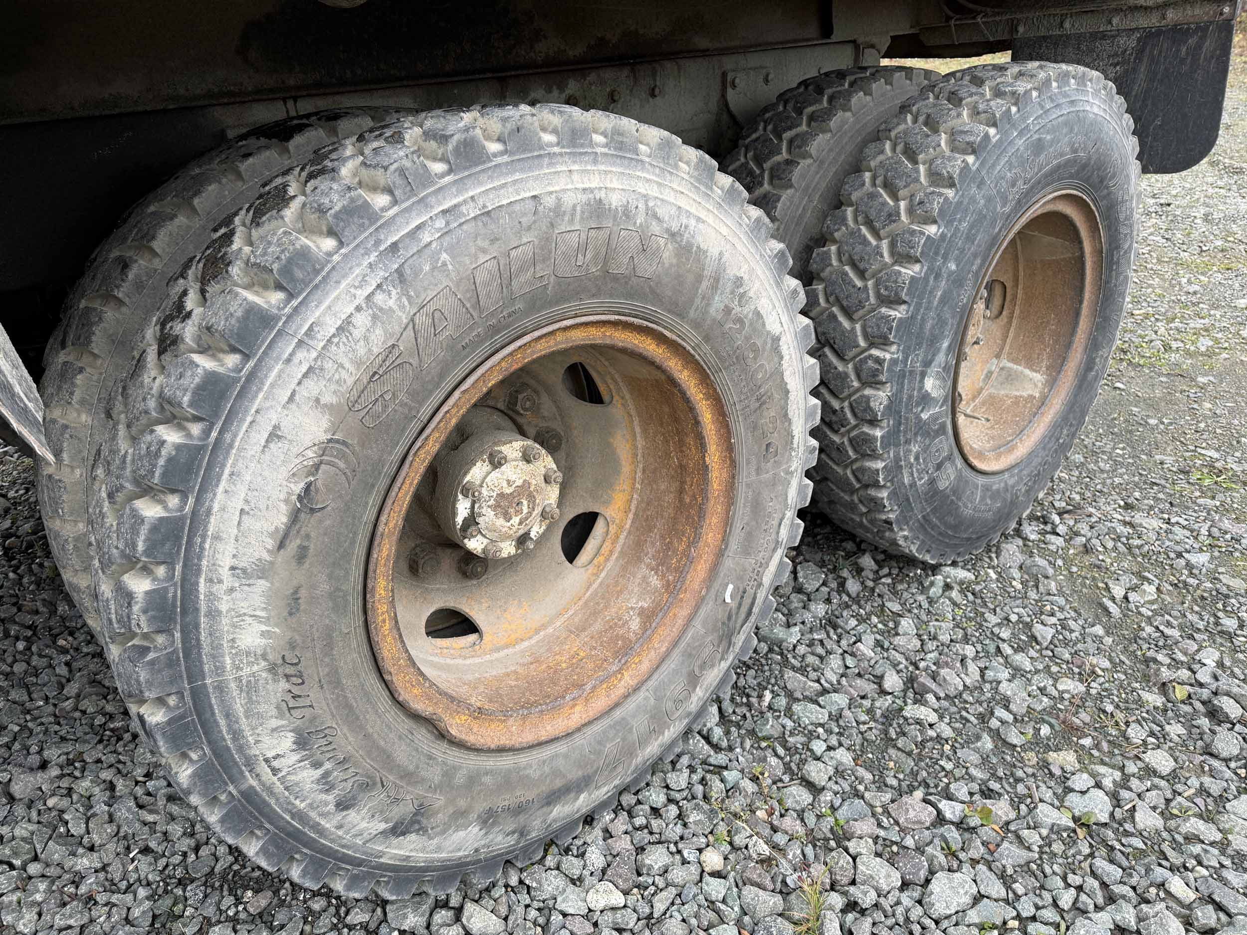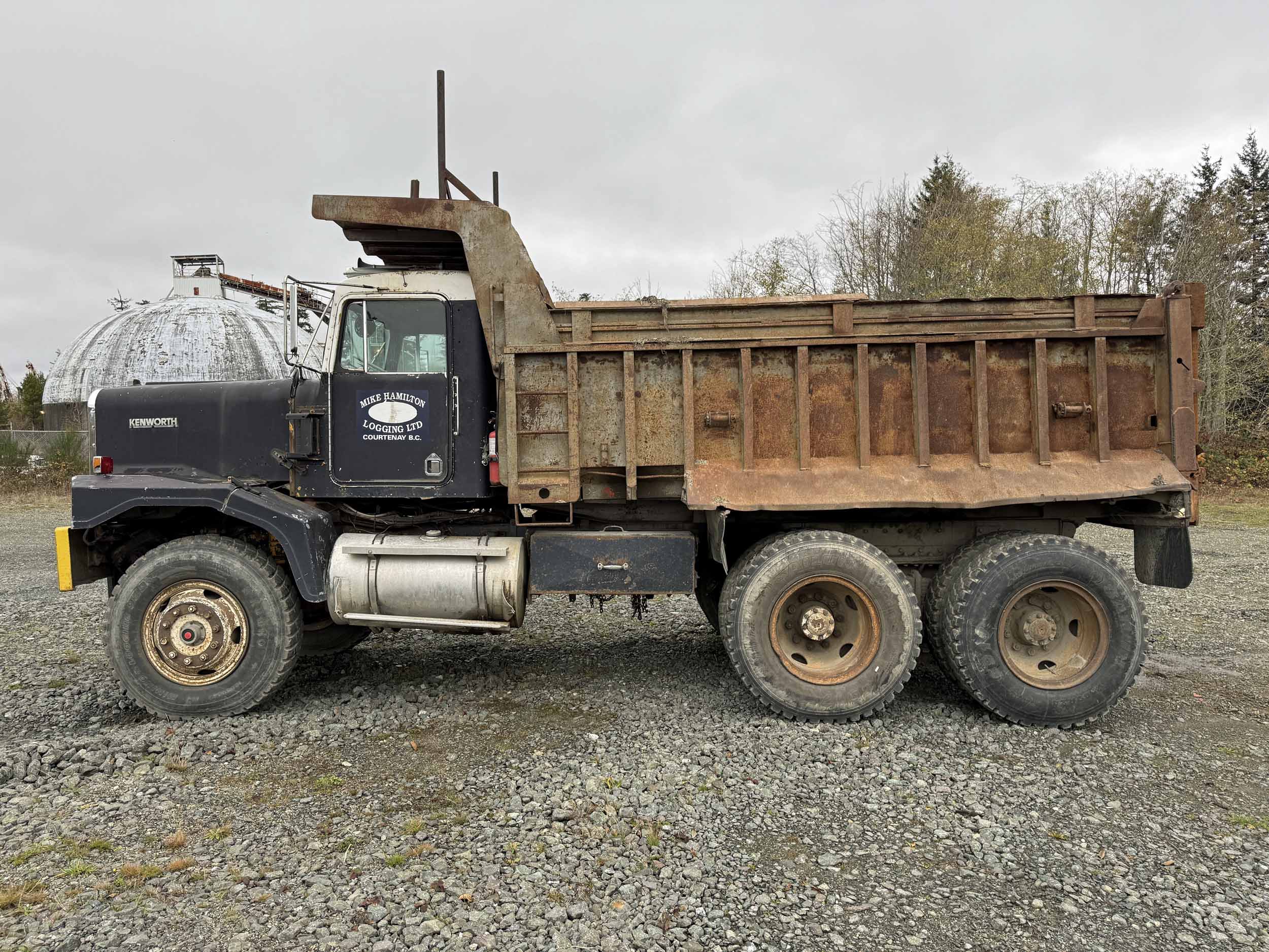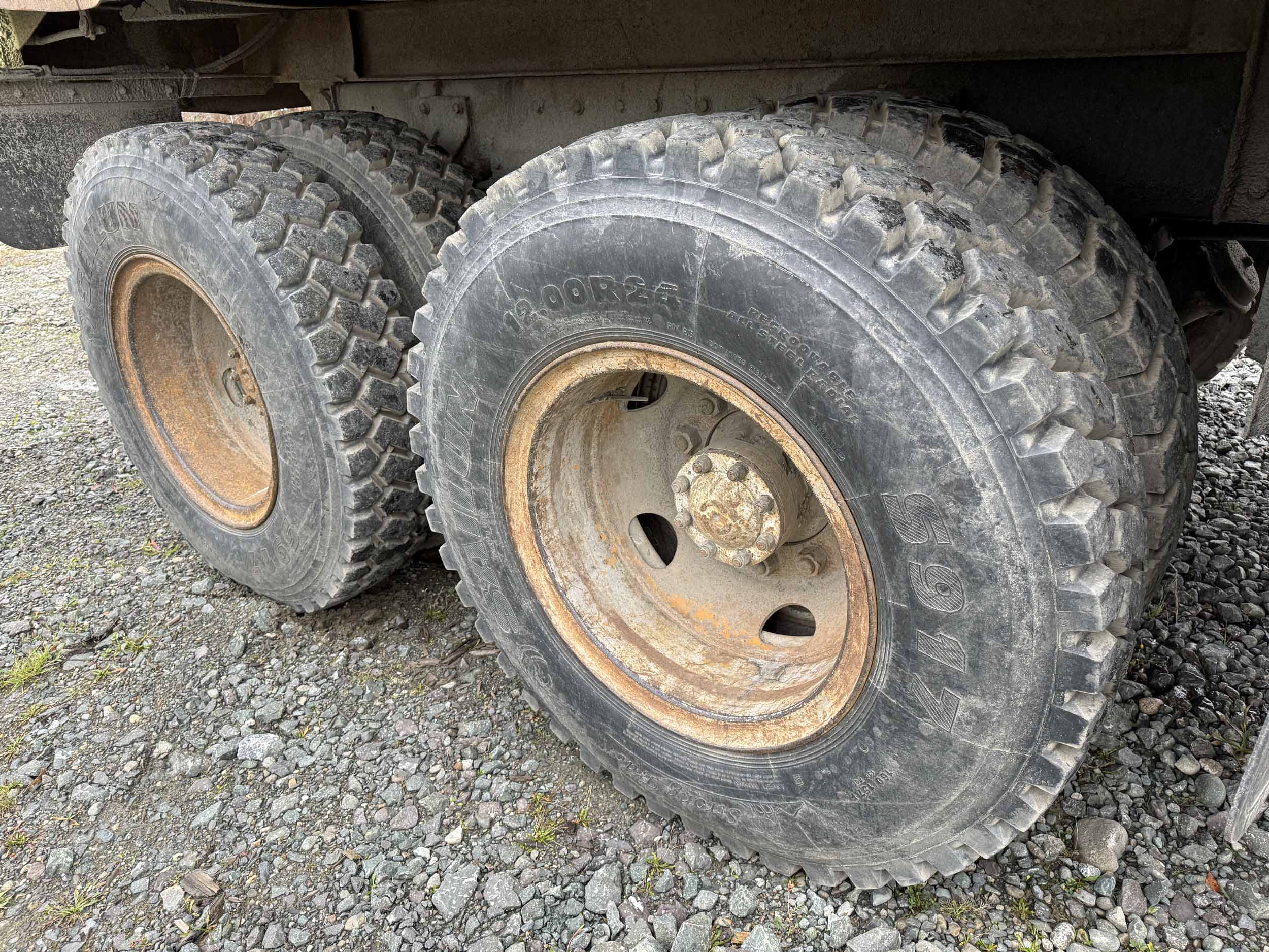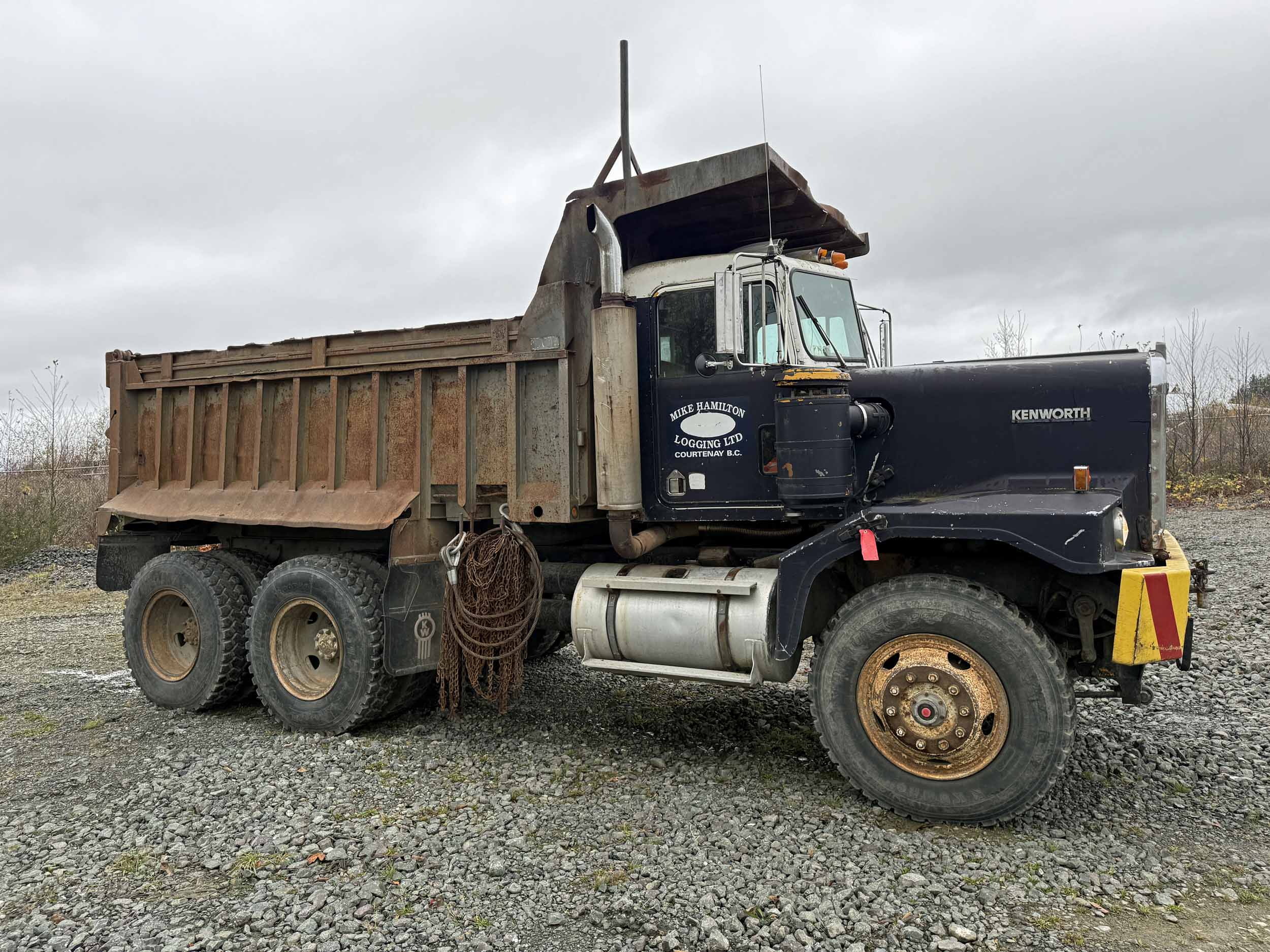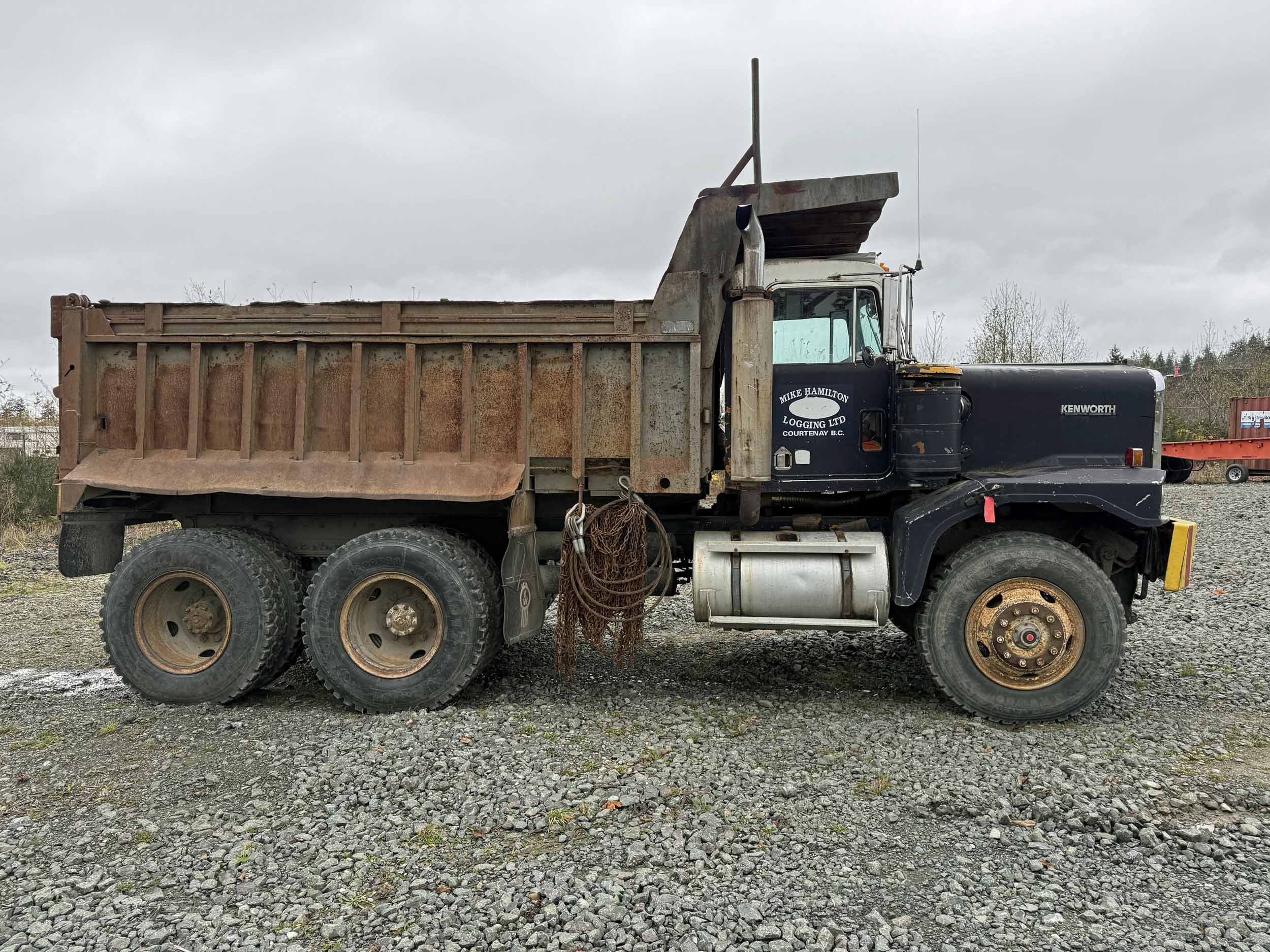 Equipped with Cummins NTC350BCII six cylinder diesel engine, 13 speed transmission, Jake brake, Kenwood VHF radio, Nahanni HD steel HD dump box with tailgate and single cylinder hoist, spring suspension, 4640 rear axles, Bud wheels, Sailun 12:00R24 tires, rear pintle hitch.
