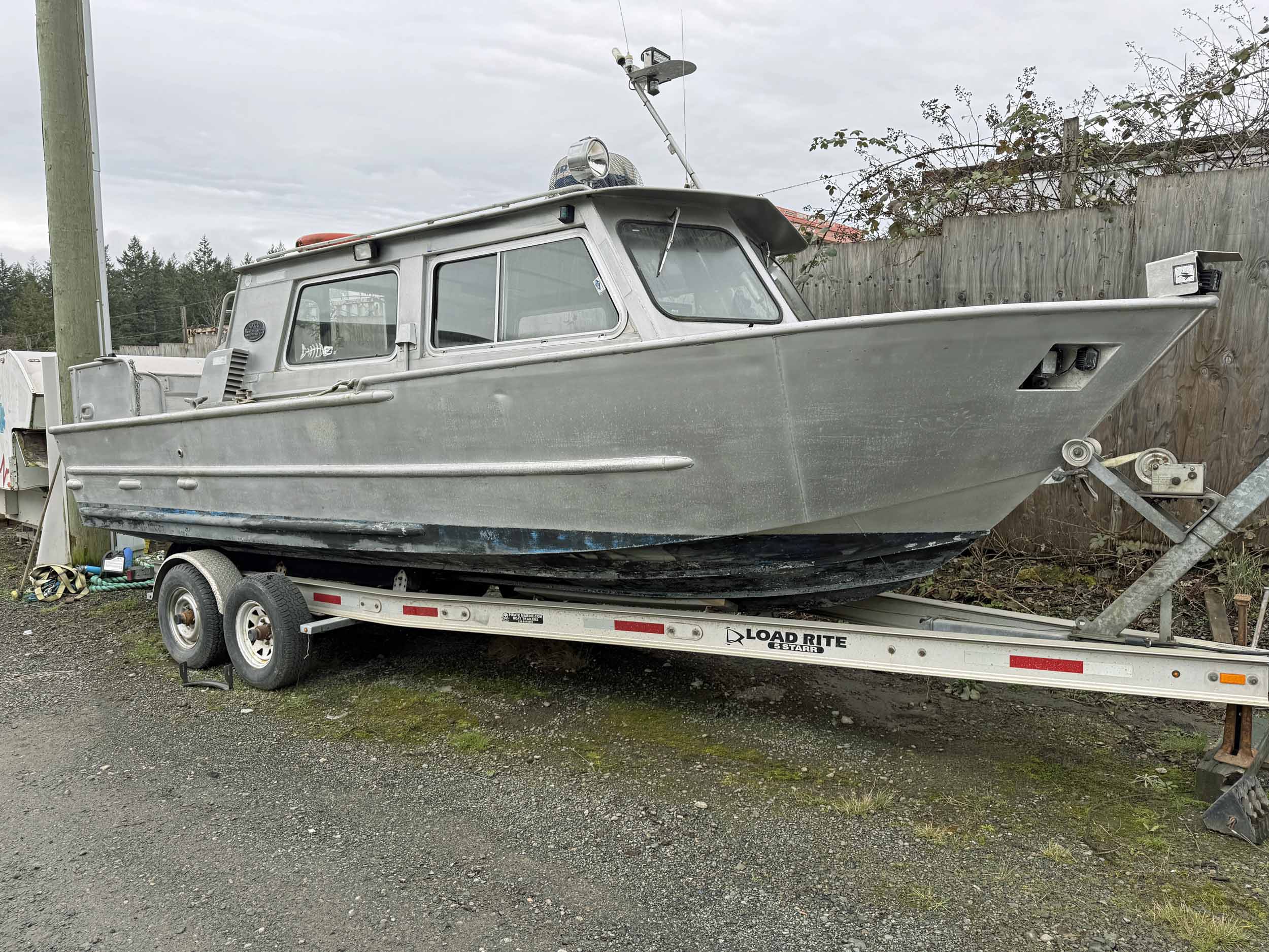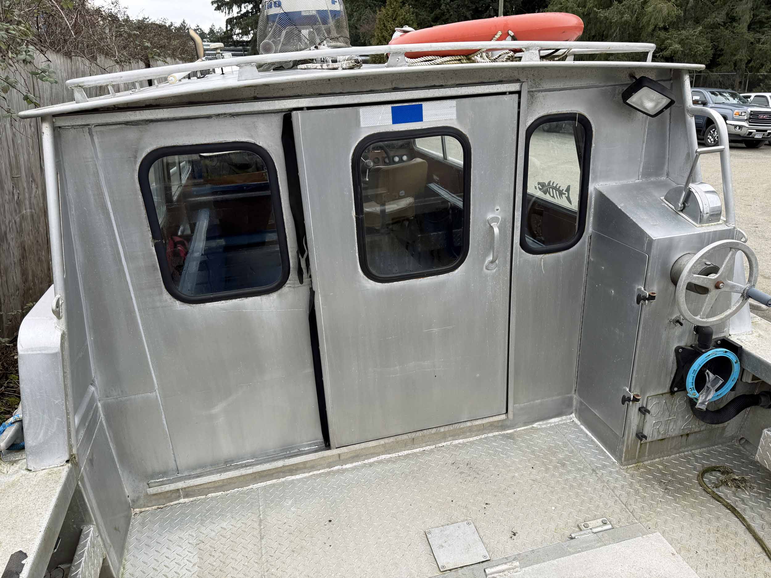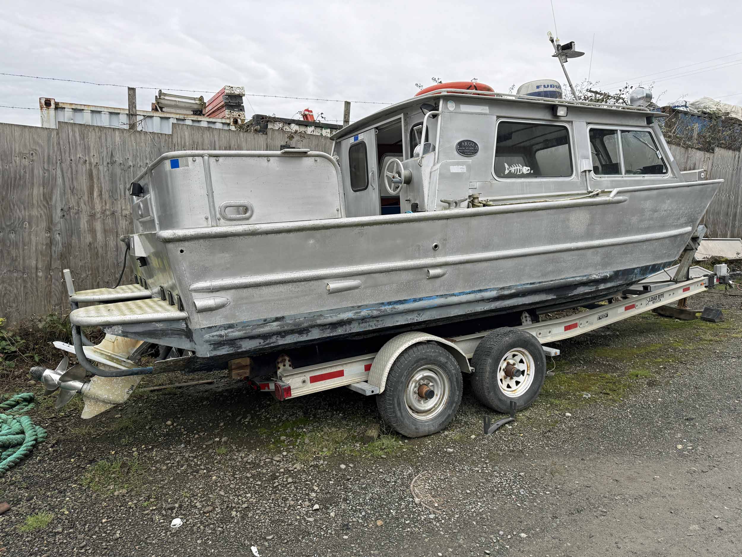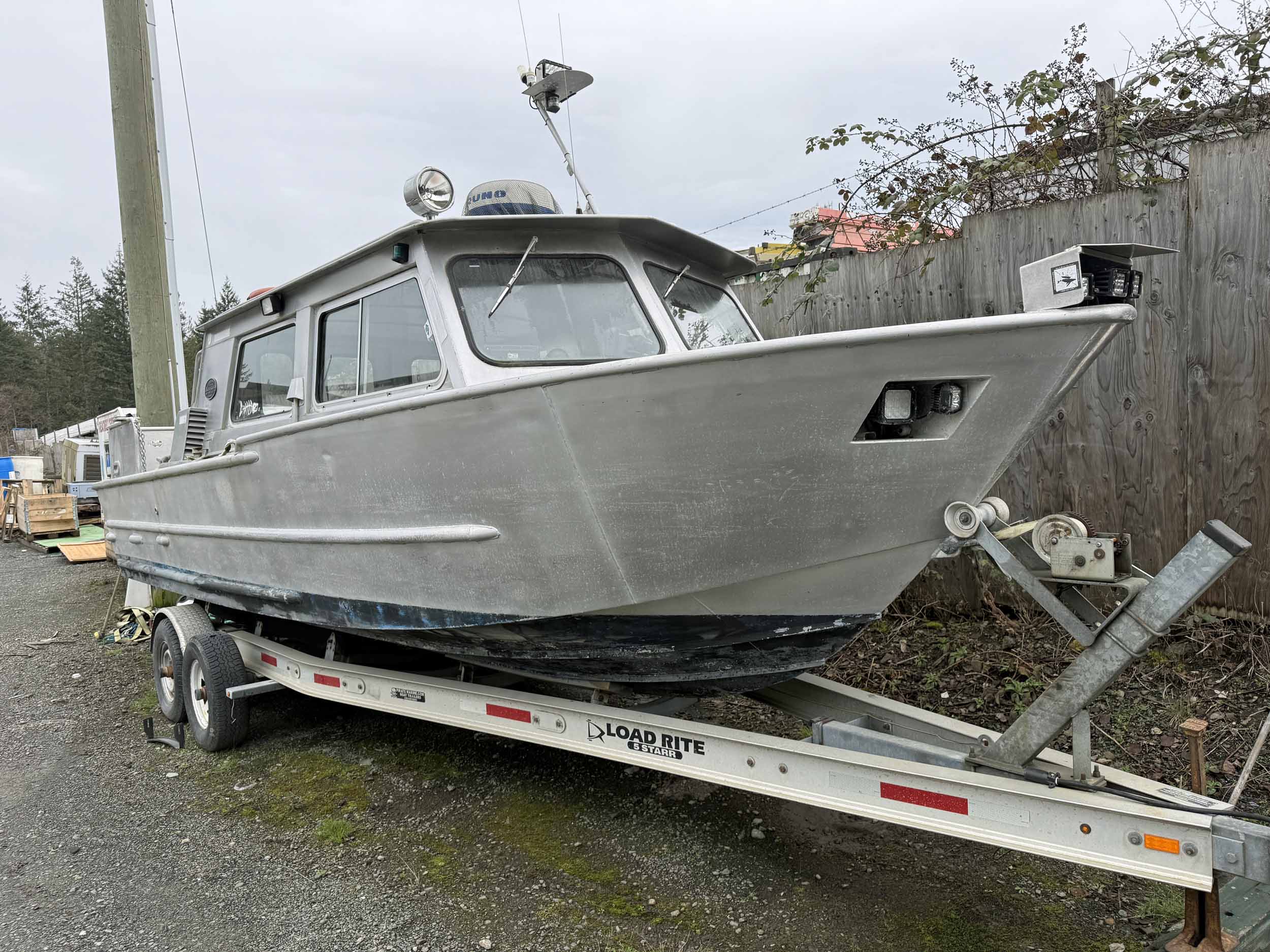 Equipped with bow mounted light package, standard cabin with two windshield wipers, Icom IC-M504 VHF radio, Standard Horizon GPS Chart CP300 chartplotter, Furuno radar, compass, searchlight, Rule bildge pump, Seastar hydraulic steering, trim tabs, cabin heater, swivelling captain’s chair, front passenger seat with storage underneath, port and starboard mounted bench seating, sliding rear cabin door, twin fuel tanks, aux. rear station, Volvo KAD43 engine with Volvo duo prop leg, side and rear deck work lights, navigation lights, down rigger mounts, rod holders, rear swim grid. 2013 Roadstar T/A Aluminum Boat T railer equipped with bunks, Hydrastar trailer brake system, walking beam suspension, 15” steel wheels, 225/75R15 tires.