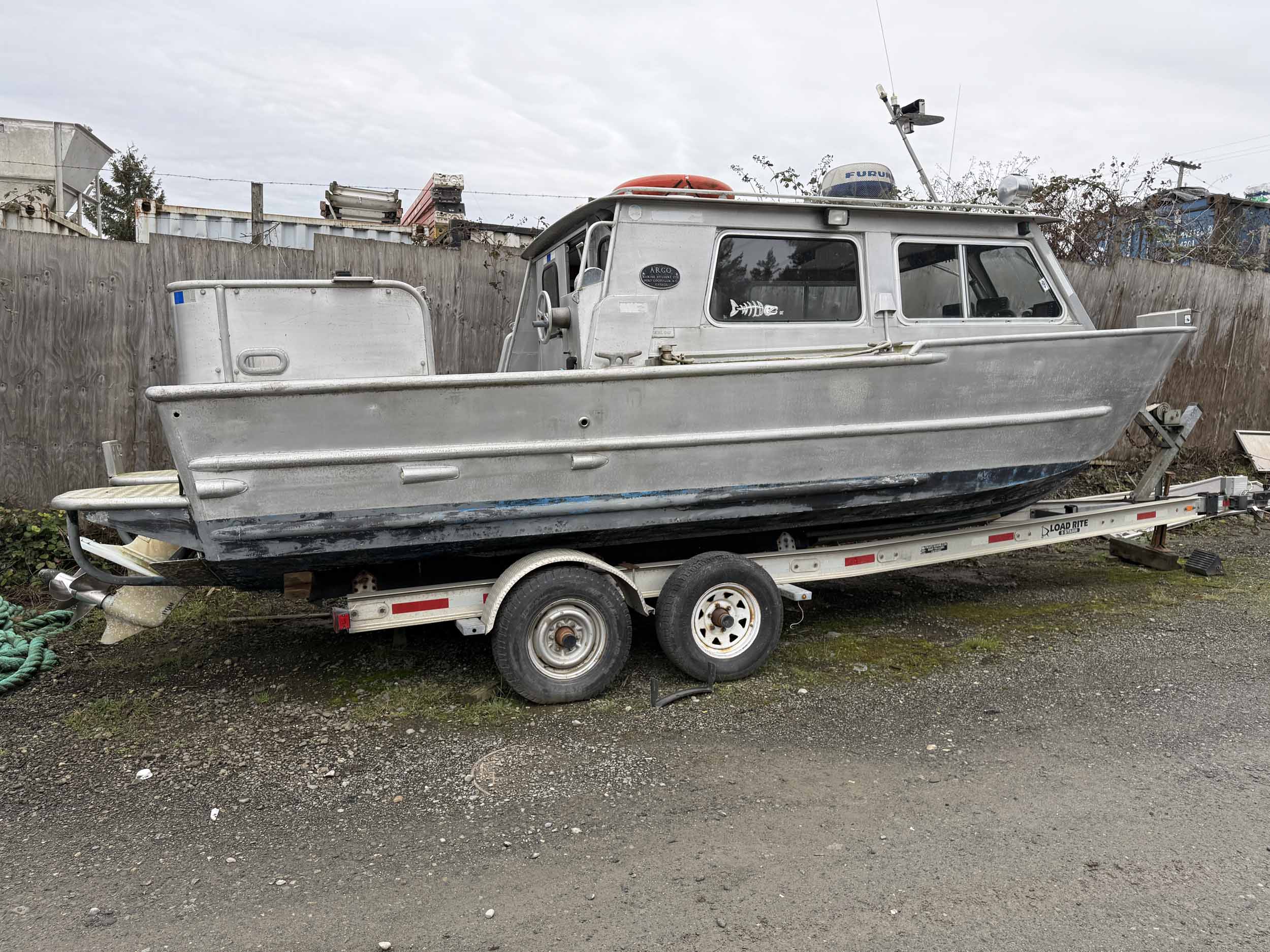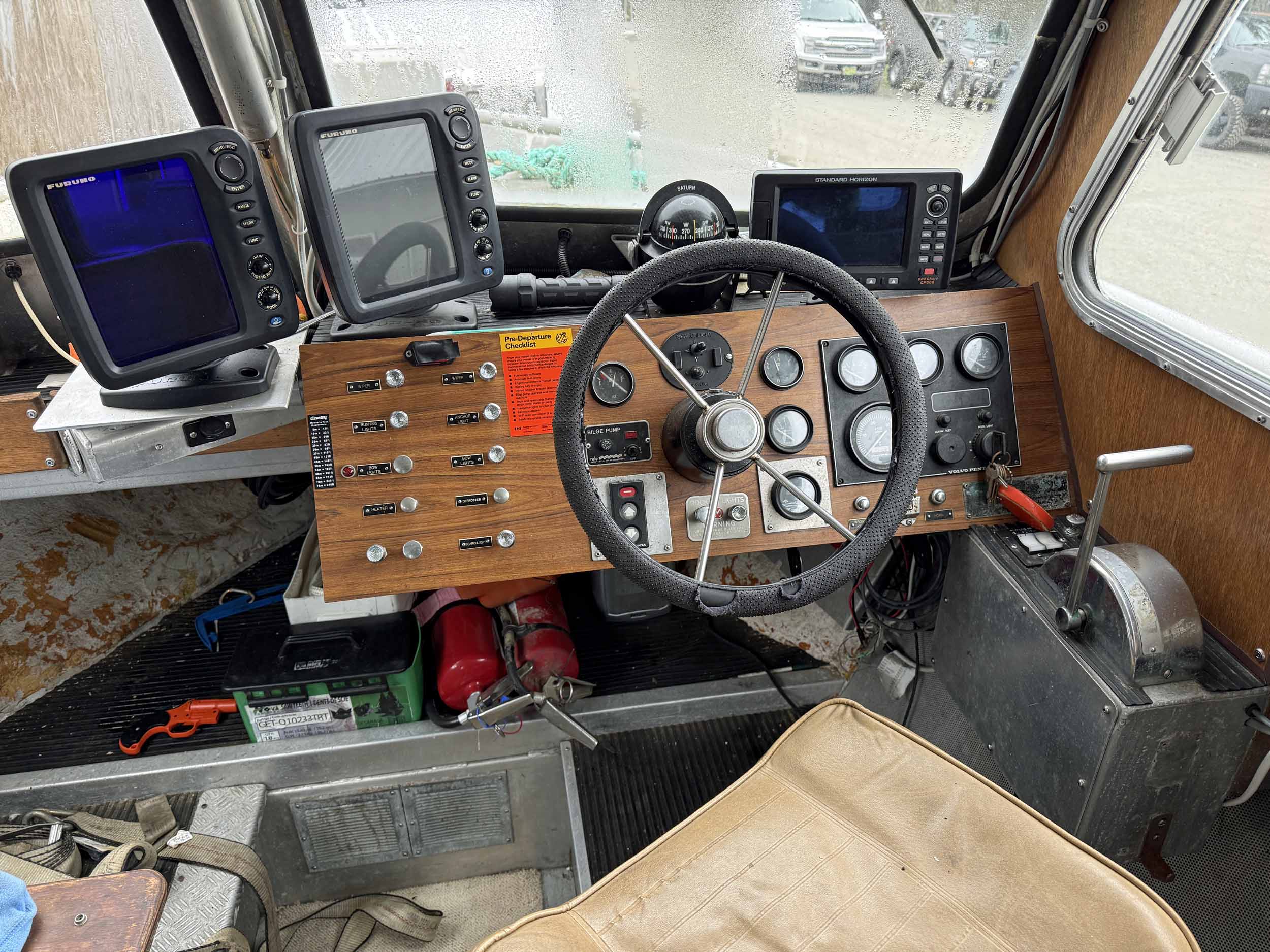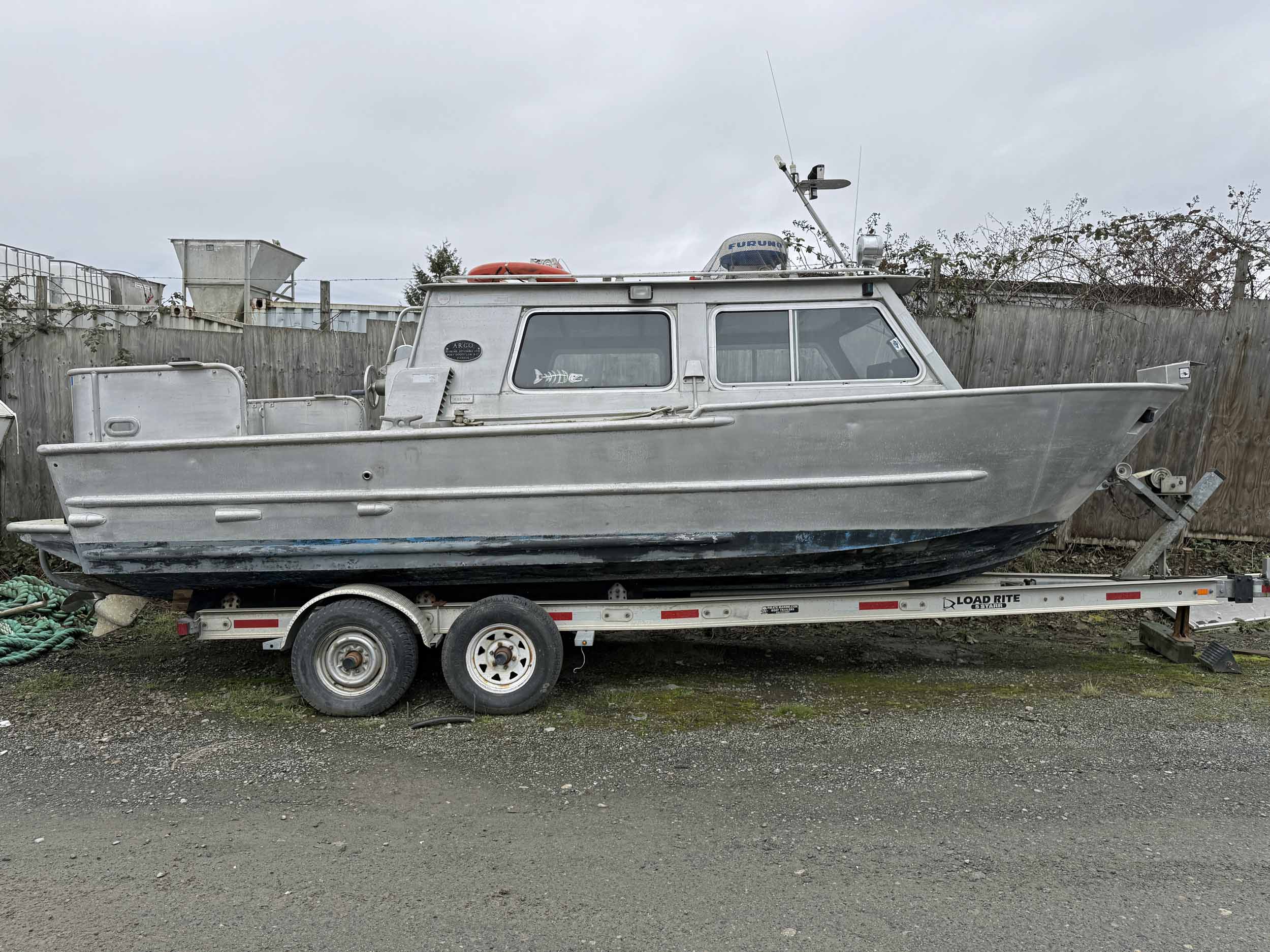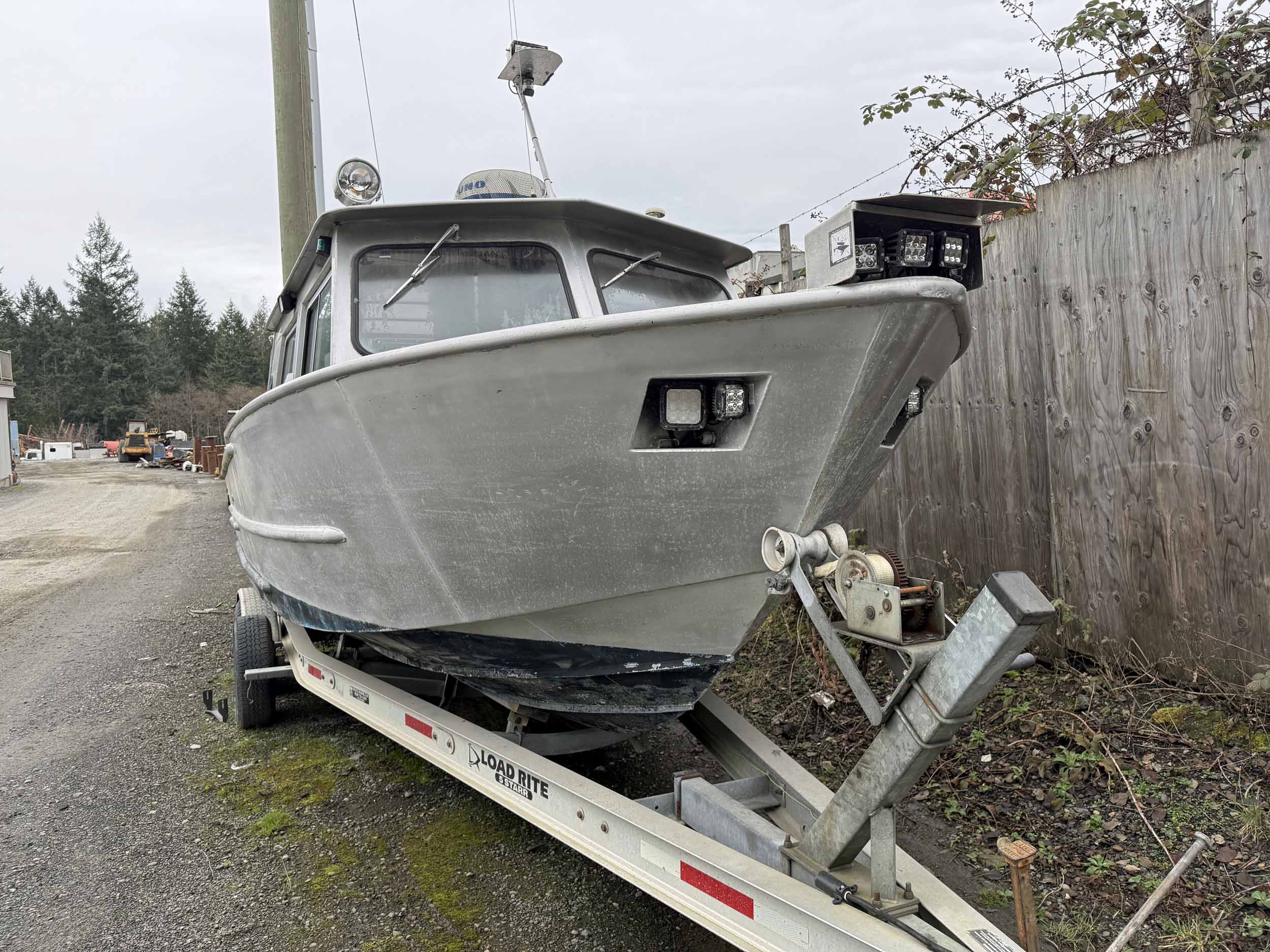 Equipped with bow mounted light package, standard cabin with two windshield wipers, Icom IC-M504 VHF radio, Standard Horizon GPS Chart CP300 chartplotter, Furuno radar, compass, searchlight, Rule bildge pump, Seastar hydraulic steering, trim tabs, cabin heater, swivelling captain’s chair, front passenger seat with storage underneath, port and starboard mounted bench seating, sliding rear cabin door, twin fuel tanks, aux. rear station, Volvo KAD43 engine with Volvo duo prop leg, side and rear deck work lights, navigation lights, down rigger mounts, rod holders, rear swim grid. 2013 Roadstar T/A Aluminum Boat T railer equipped with bunks, Hydrastar trailer brake system, walking beam suspension, 15” steel wheels, 225/75R15 tires.