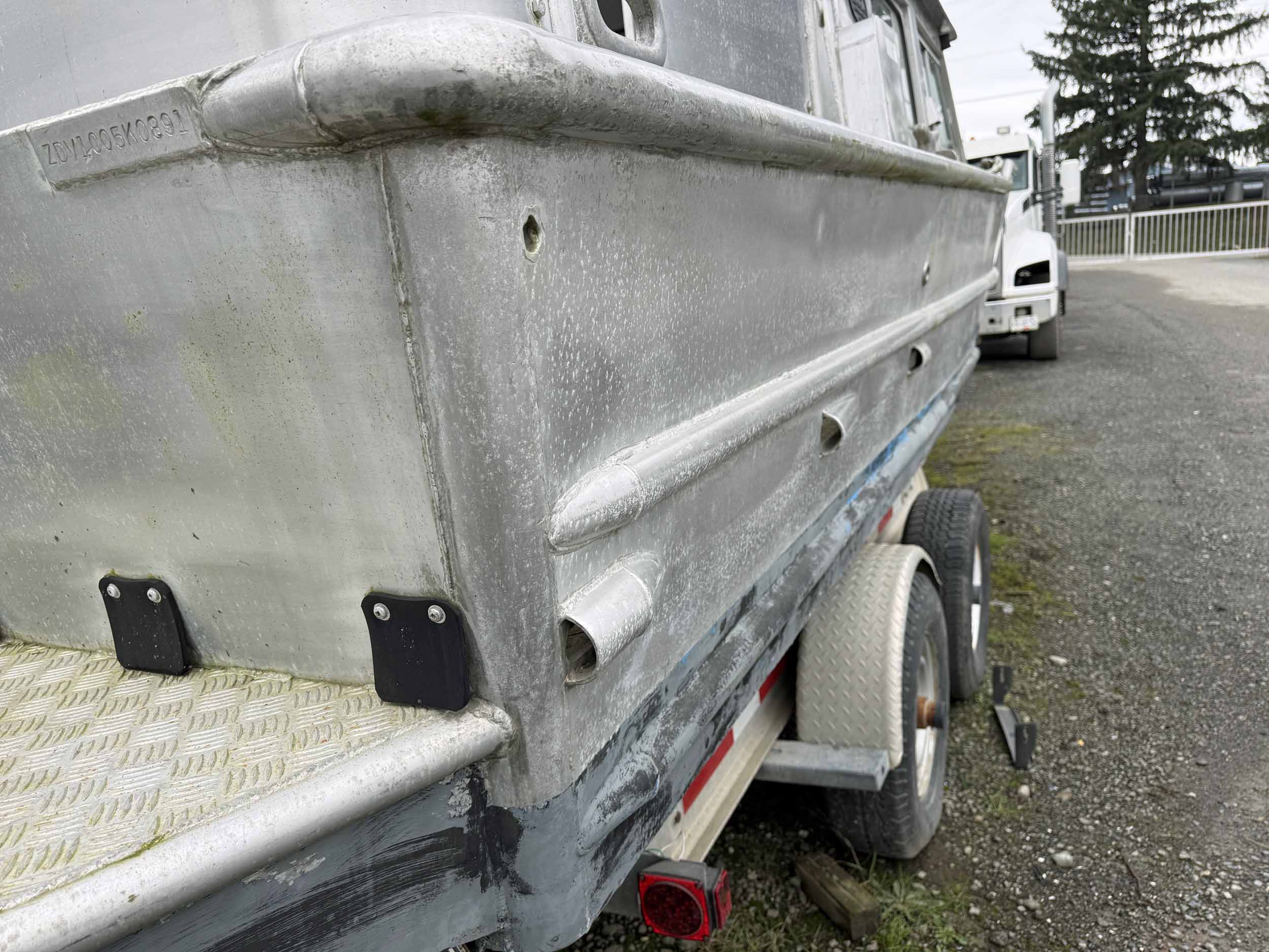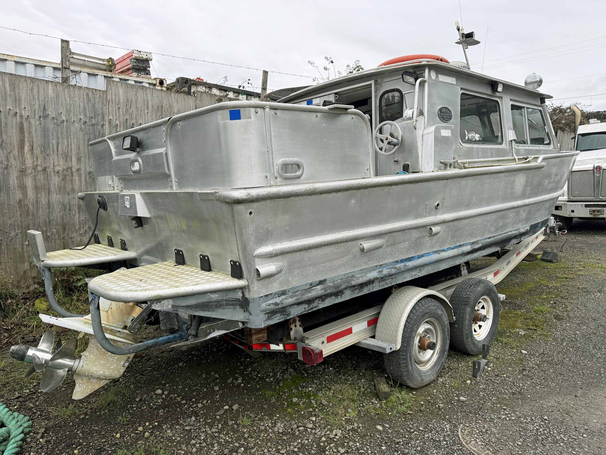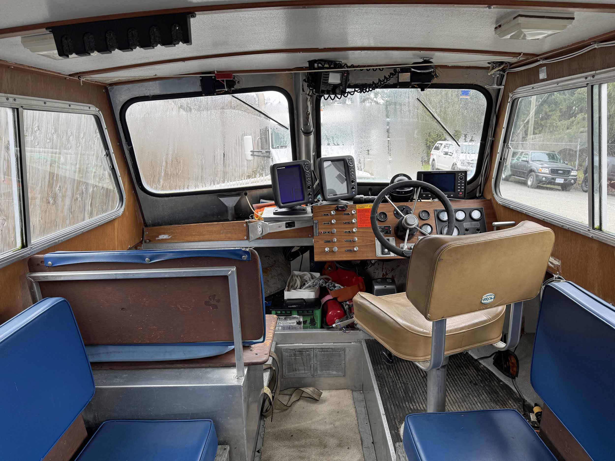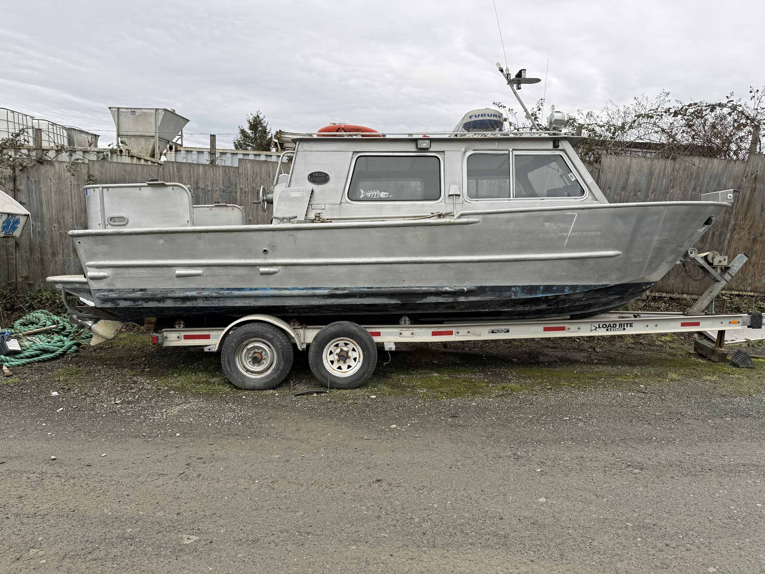 Equipped with bow mounted light package, standard cabin with two windshield wipers, Icom IC-M504 VHF radio, Standard Horizon GPS Chart CP300 chartplotter, Furuno radar, compass, searchlight, Rule bildge pump, Seastar hydraulic steering, trim tabs, cabin heater, swivelling captain’s chair, front passenger seat with storage underneath, port and starboard mounted bench seating, sliding rear cabin door, twin fuel tanks, aux. rear station, Volvo KAD43 engine with Volvo duo prop leg, side and rear deck work lights, navigation lights, down rigger mounts, rod holders, rear swim grid. 2013 Roadstar T/A Aluminum Boat T railer equipped with bunks, Hydrastar trailer brake system, walking beam suspension, 15” steel wheels, 225/75R15 tires.