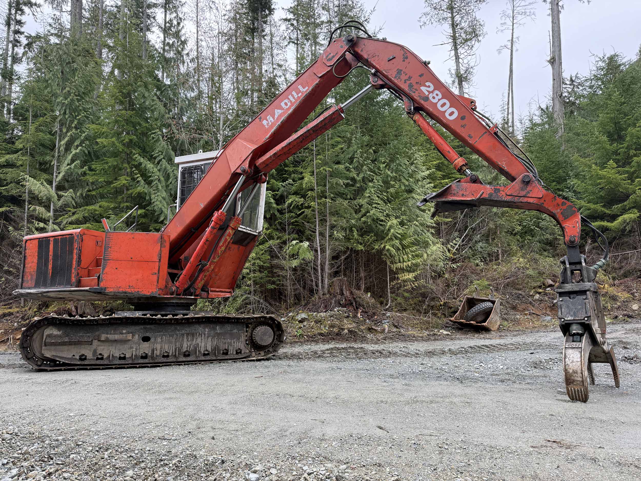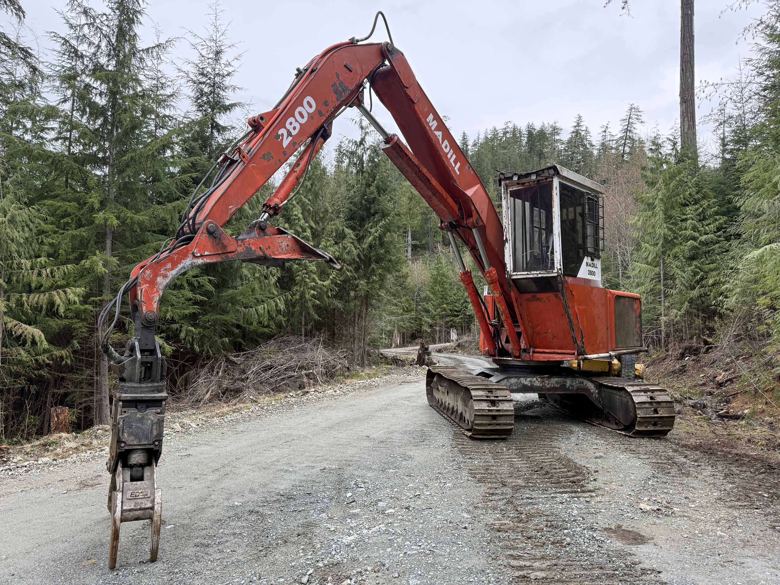 Equipped with T-Mar Extreme Duty 62” HP Mk3 log grapple, heel rack, LL front, west coast elevated rear entry cab on riser, Cummins engine, highwalker undercarriage with 28” single bar pads.