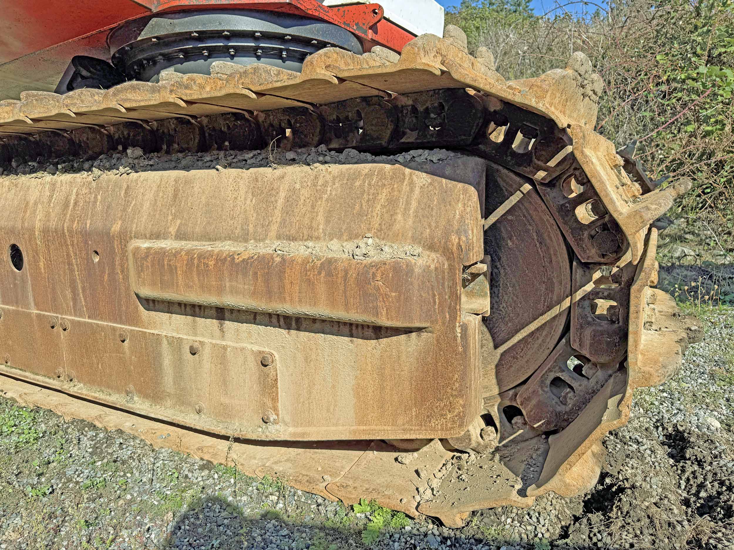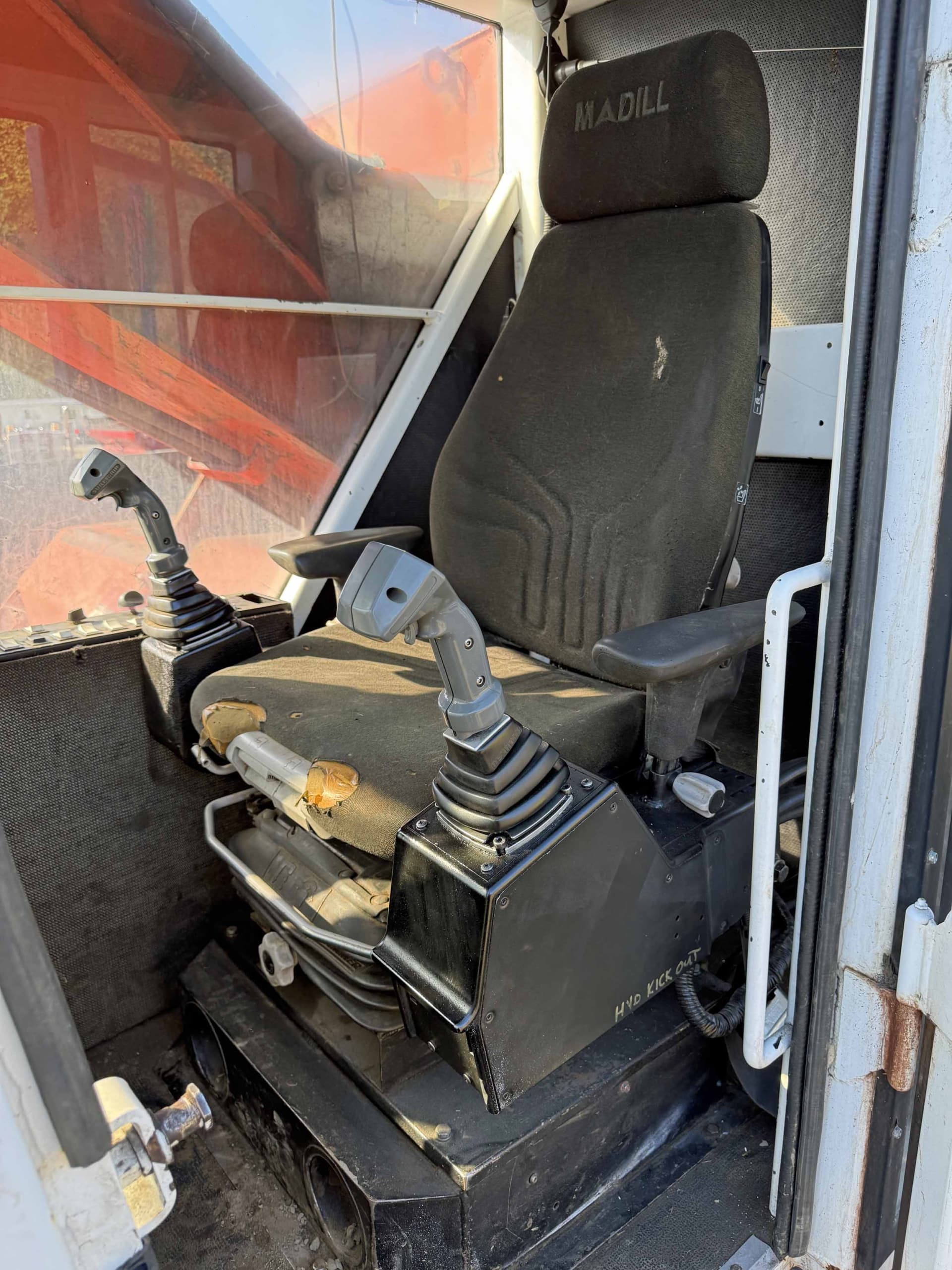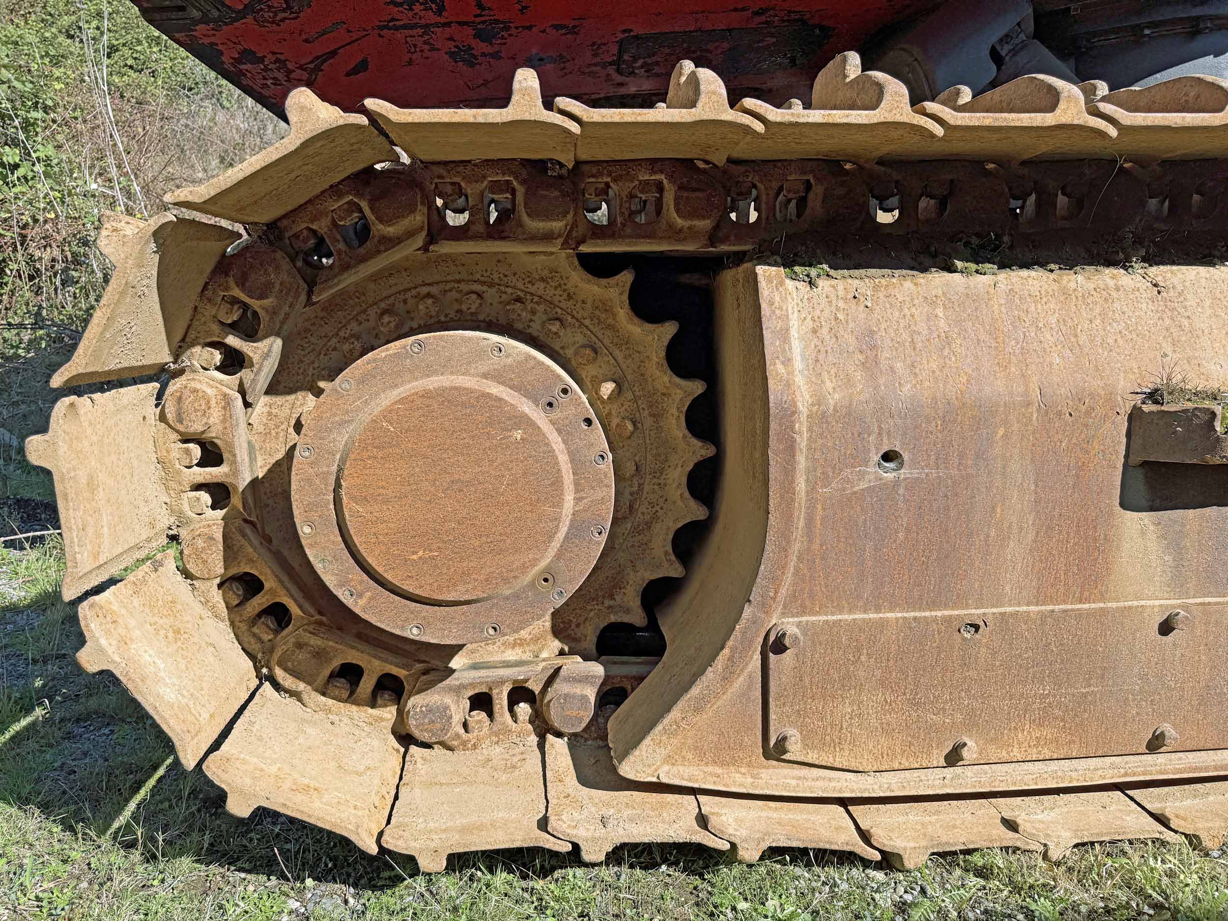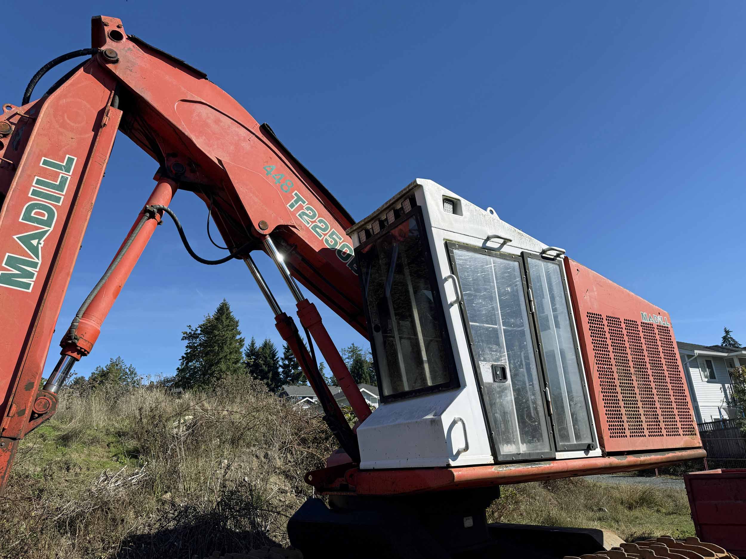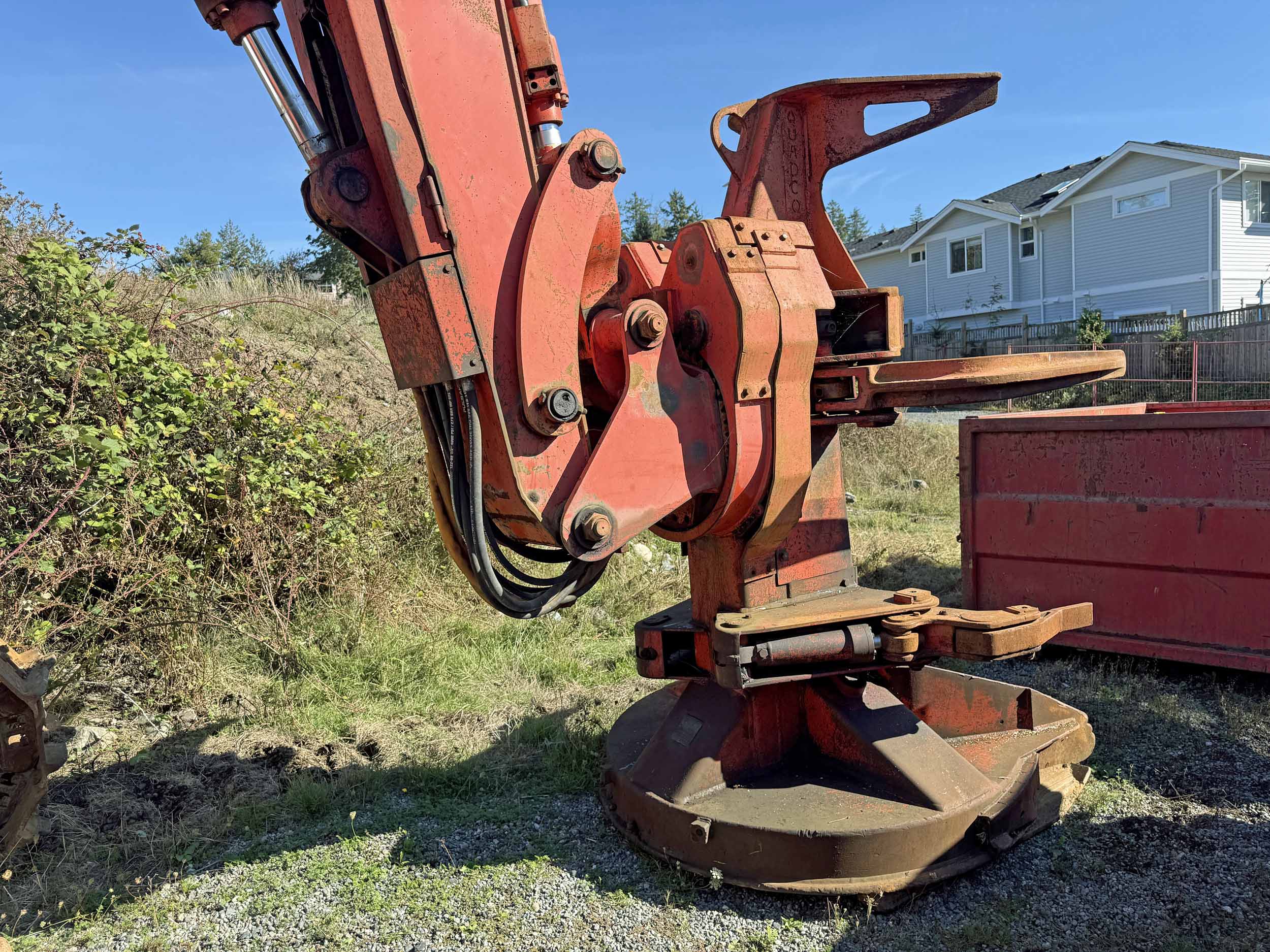 Equipped with Quadco QFH 26” felling head with 360 degree wrist, feller buncher front, ROPS cab, Amerex fire suppression system, Detroit Diesel Series 50 engine, self levelling undercarriage with 28” single bar pads with corks.