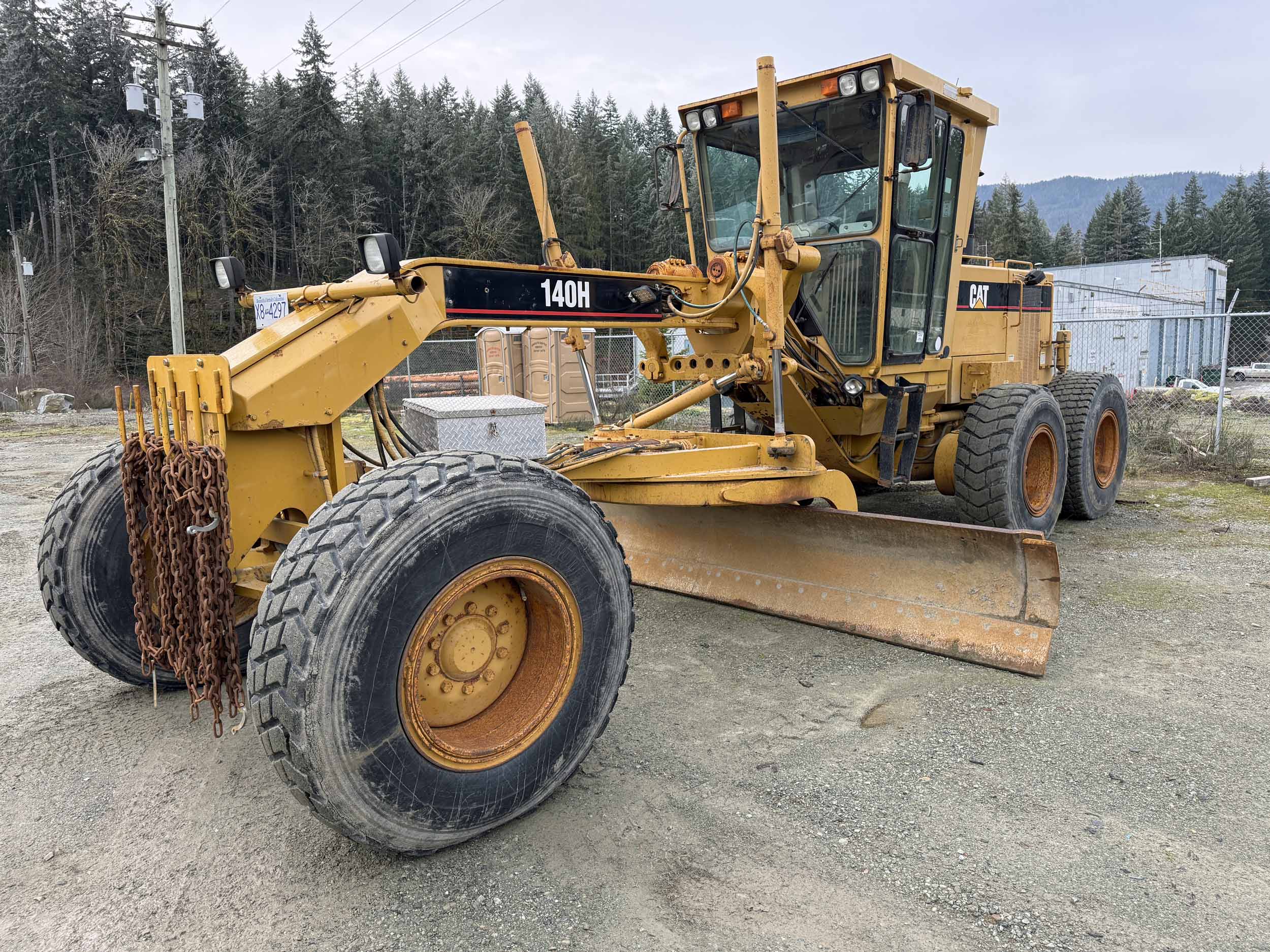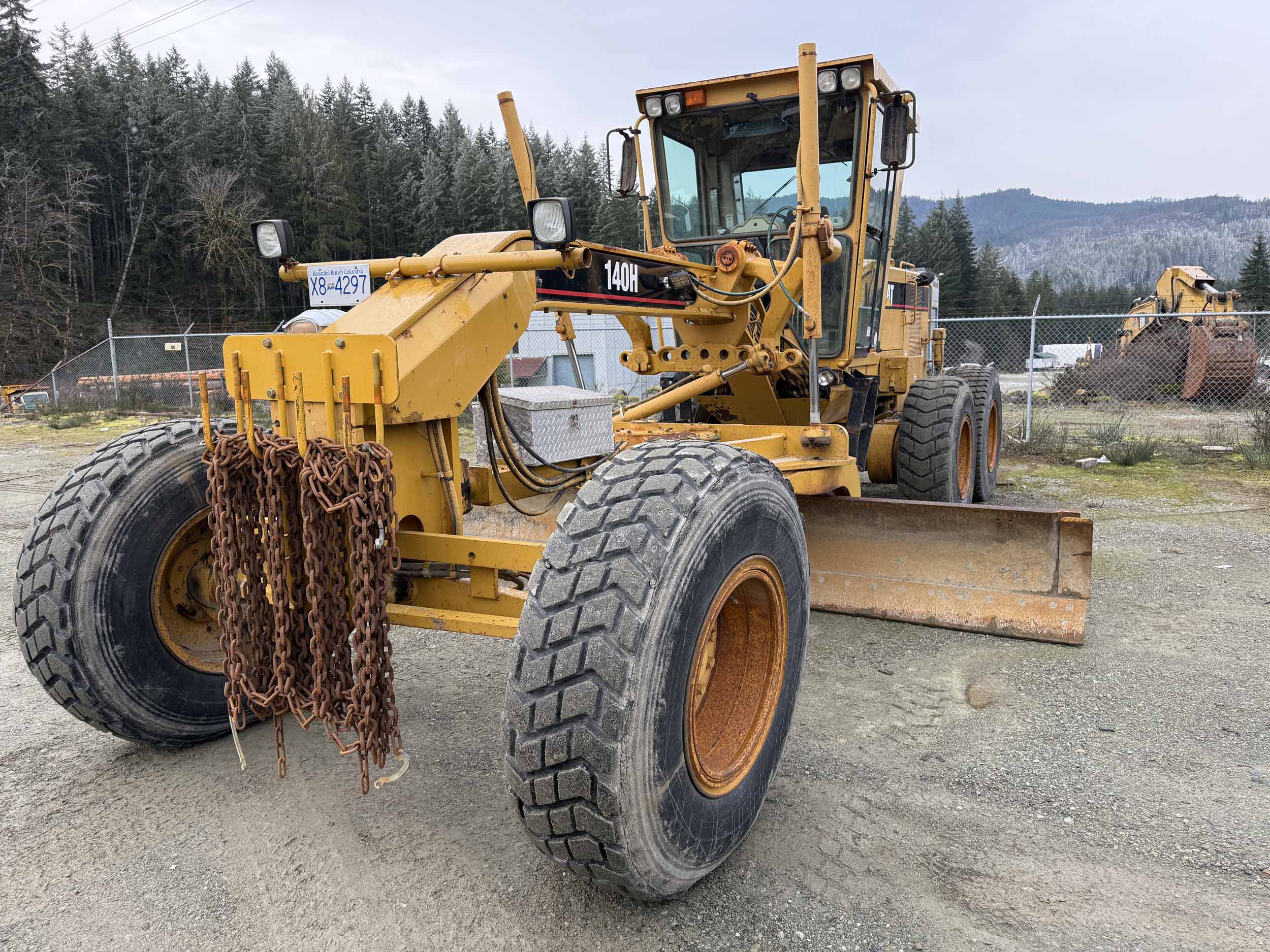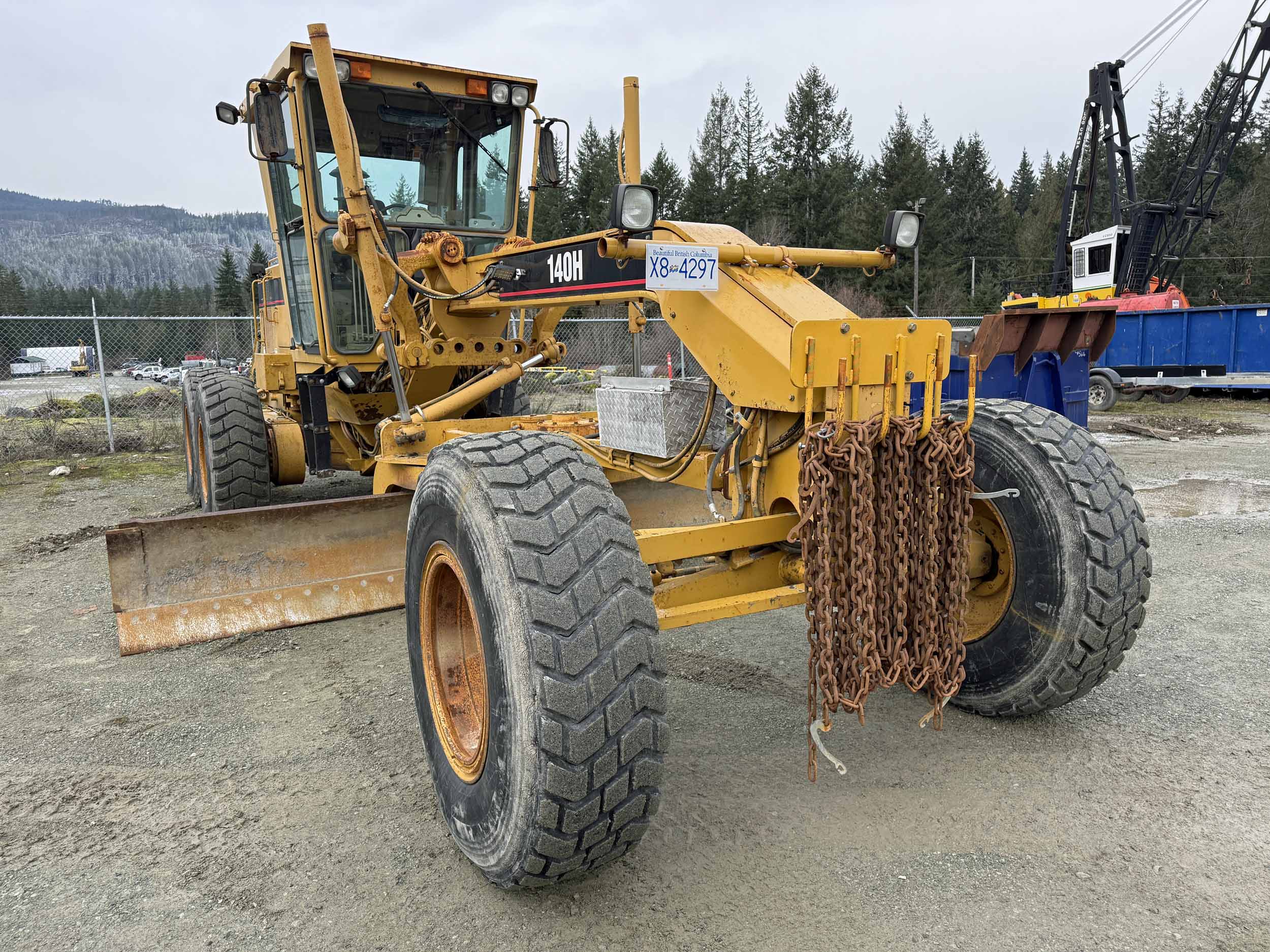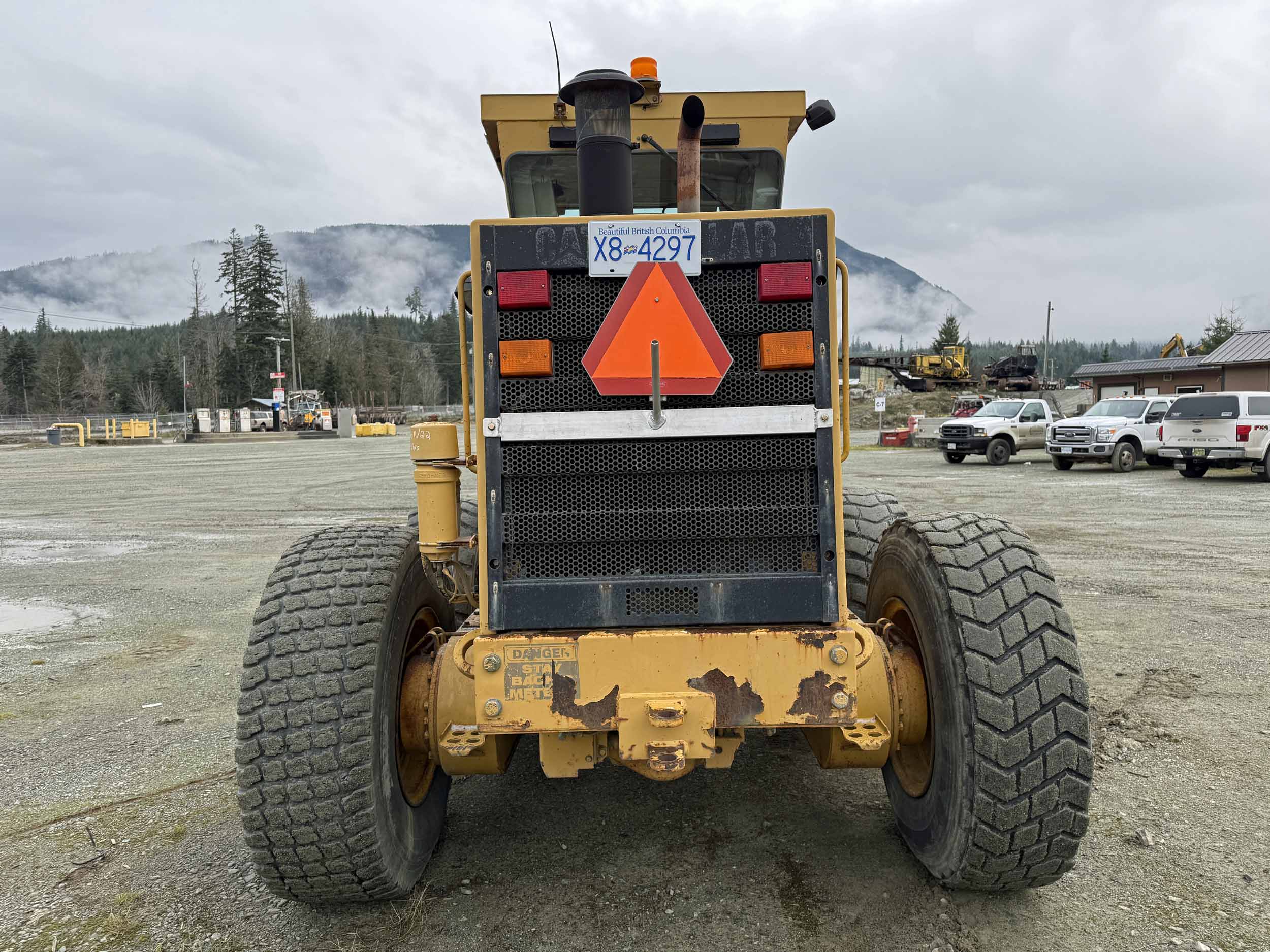 Equipped with 17.5R25 front tires, 14′ main blade, ROPS cab w/ AC, 17.5R25 rear tires.