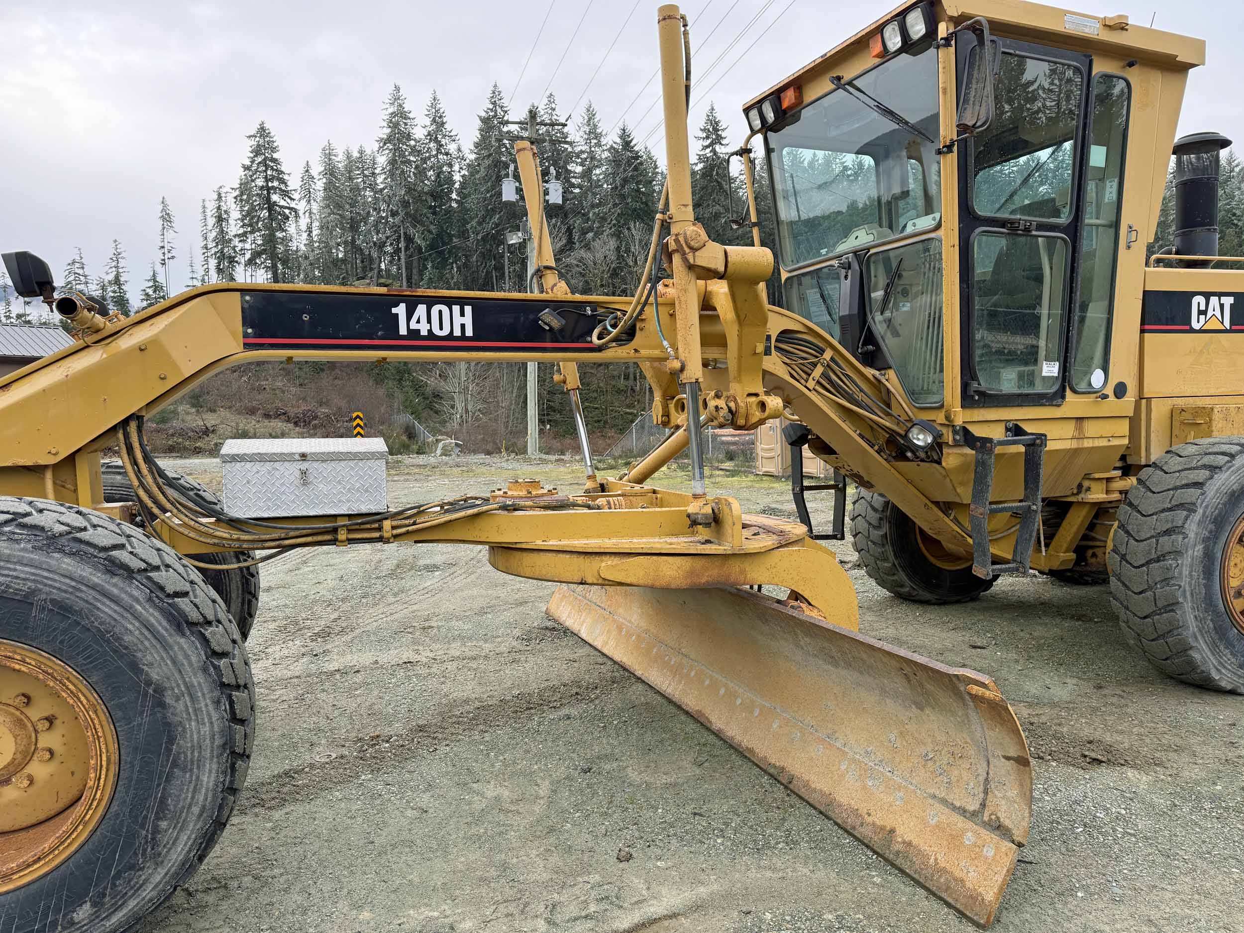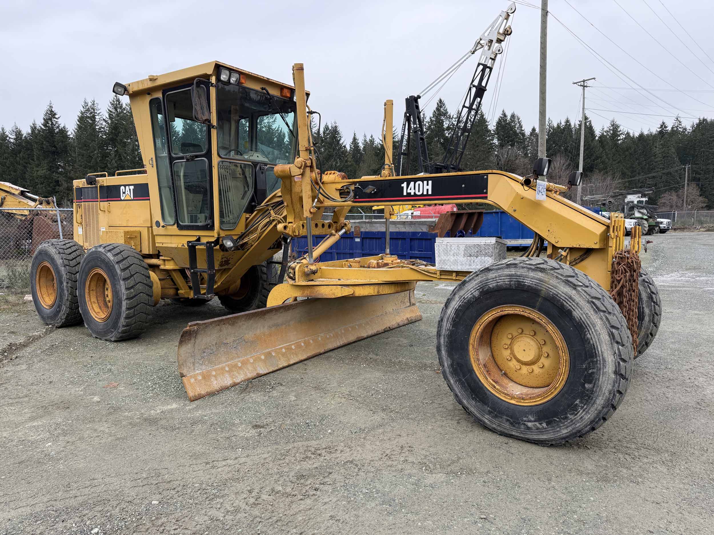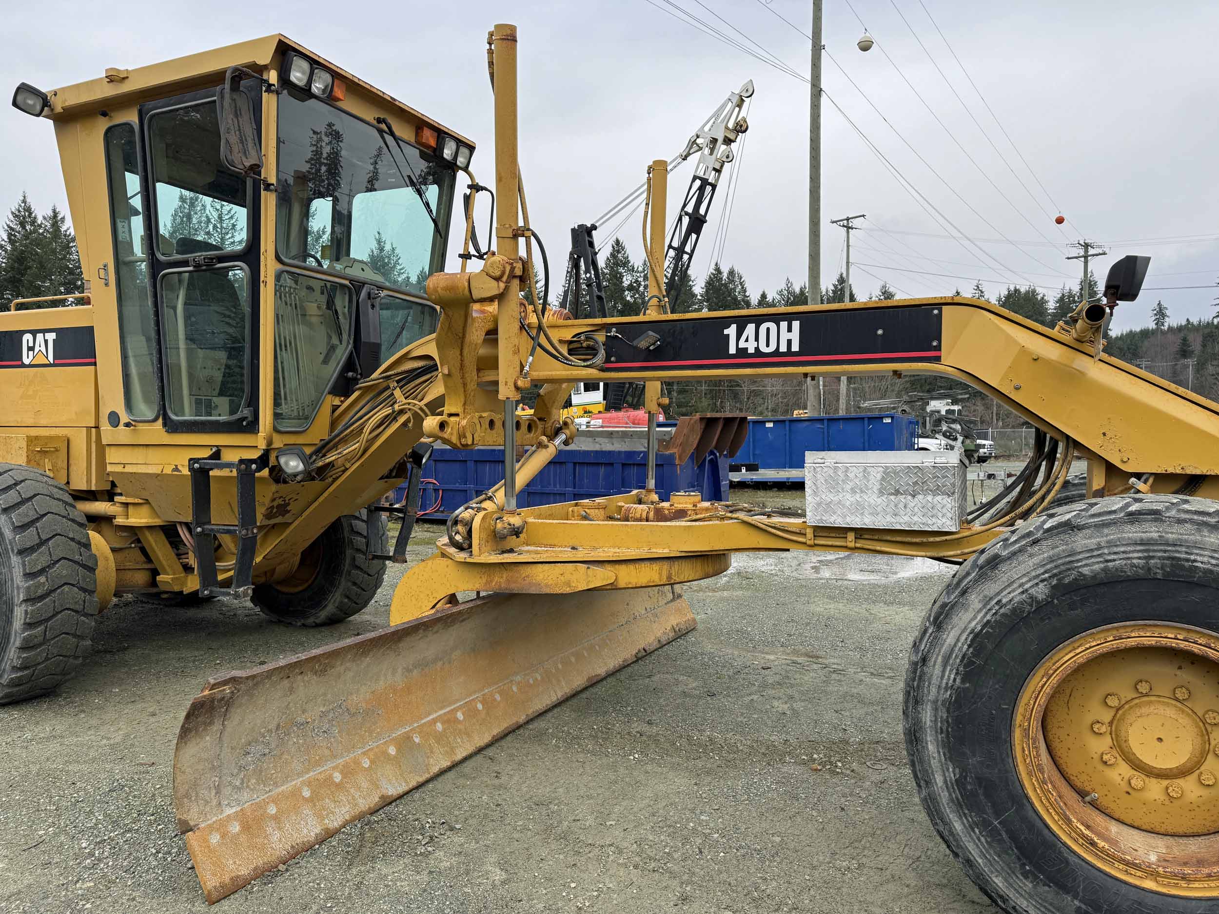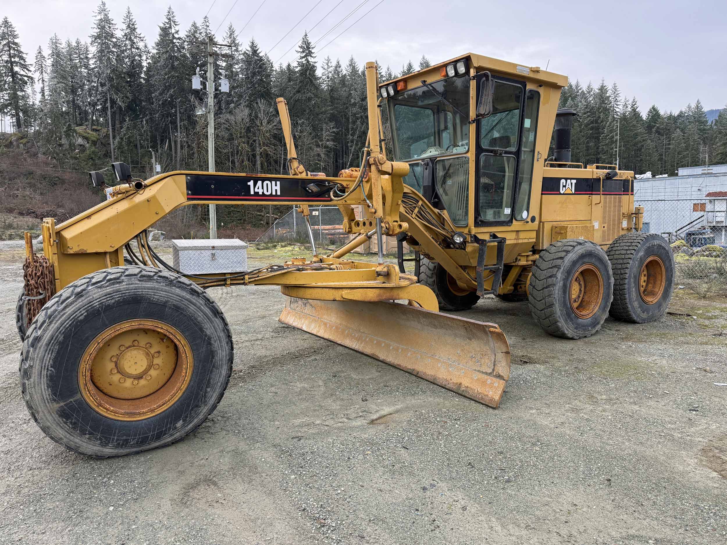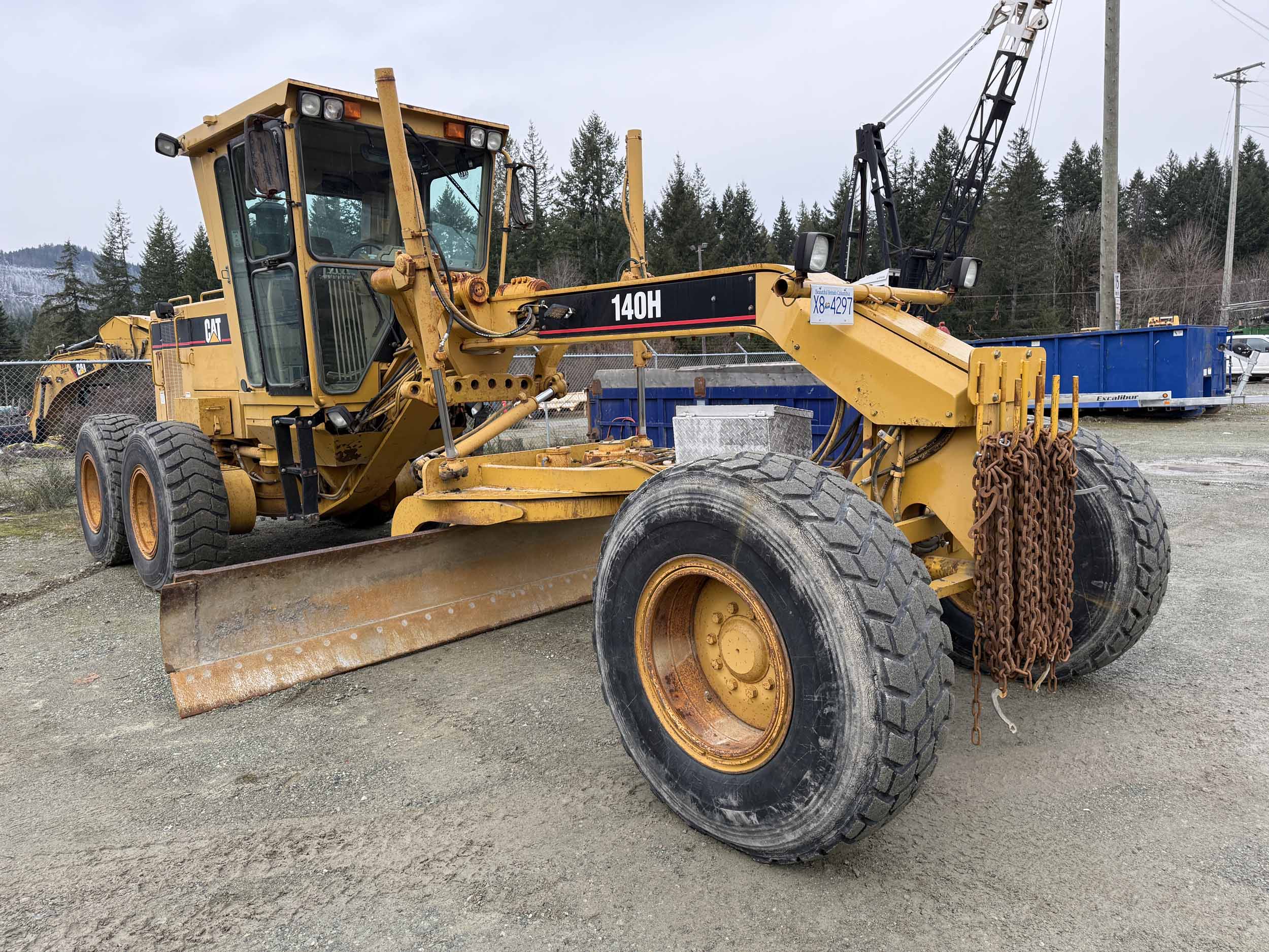 Equipped with 17.5R25 front tires, 14′ main blade, ROPS cab w/ AC, 17.5R25 rear tires.