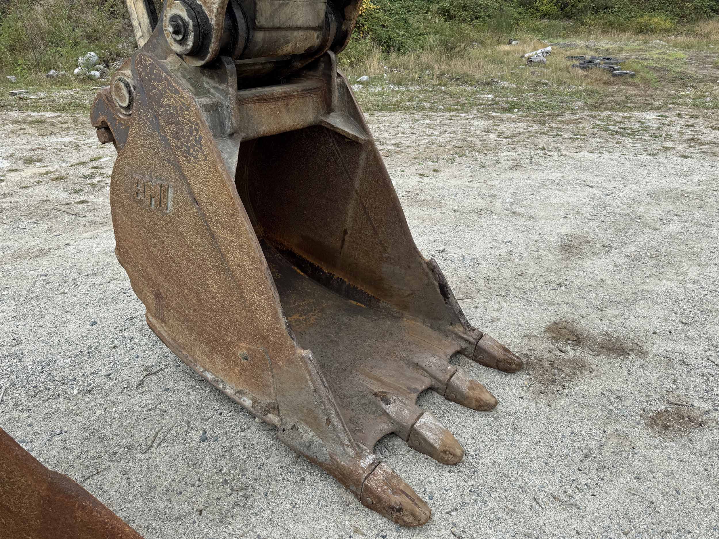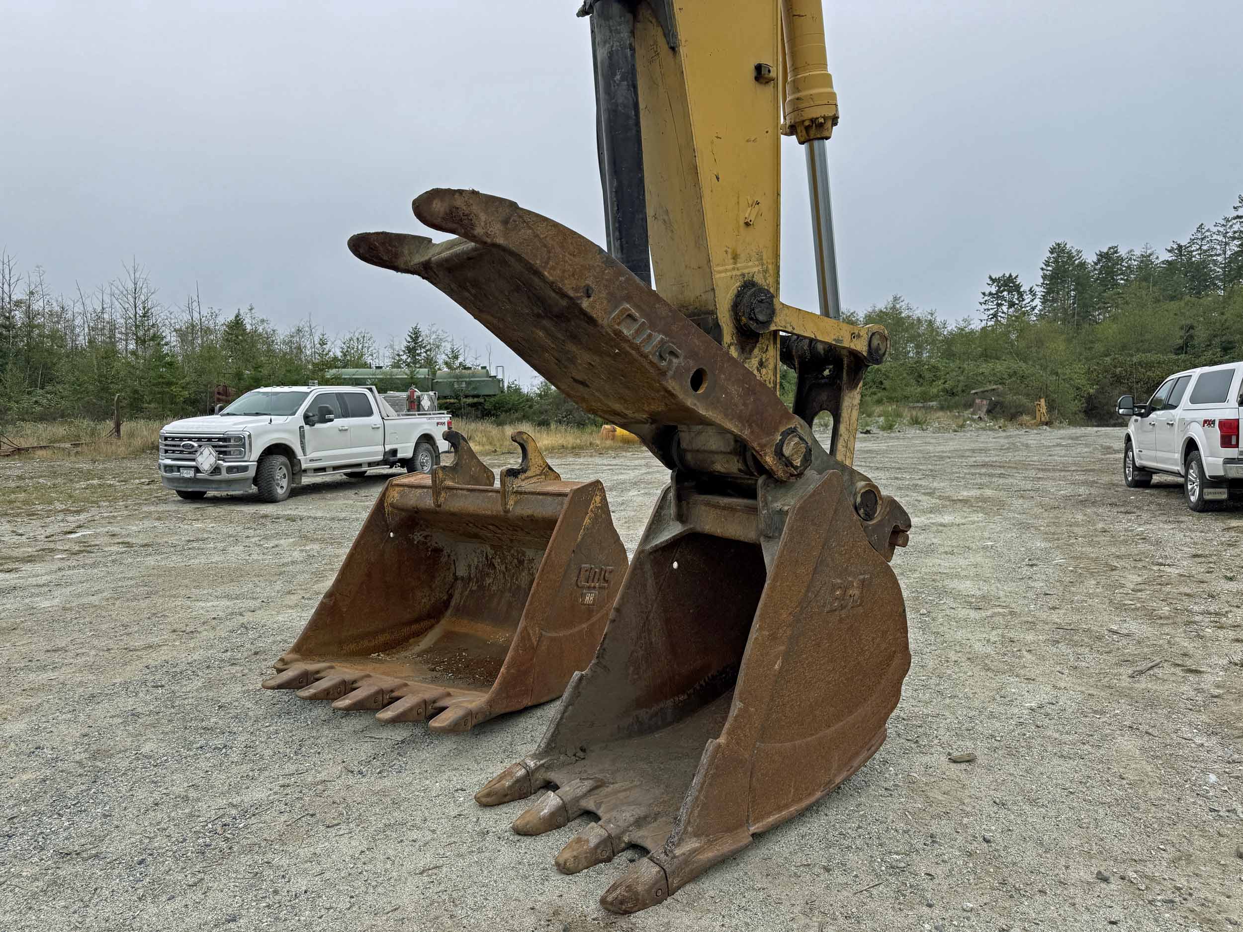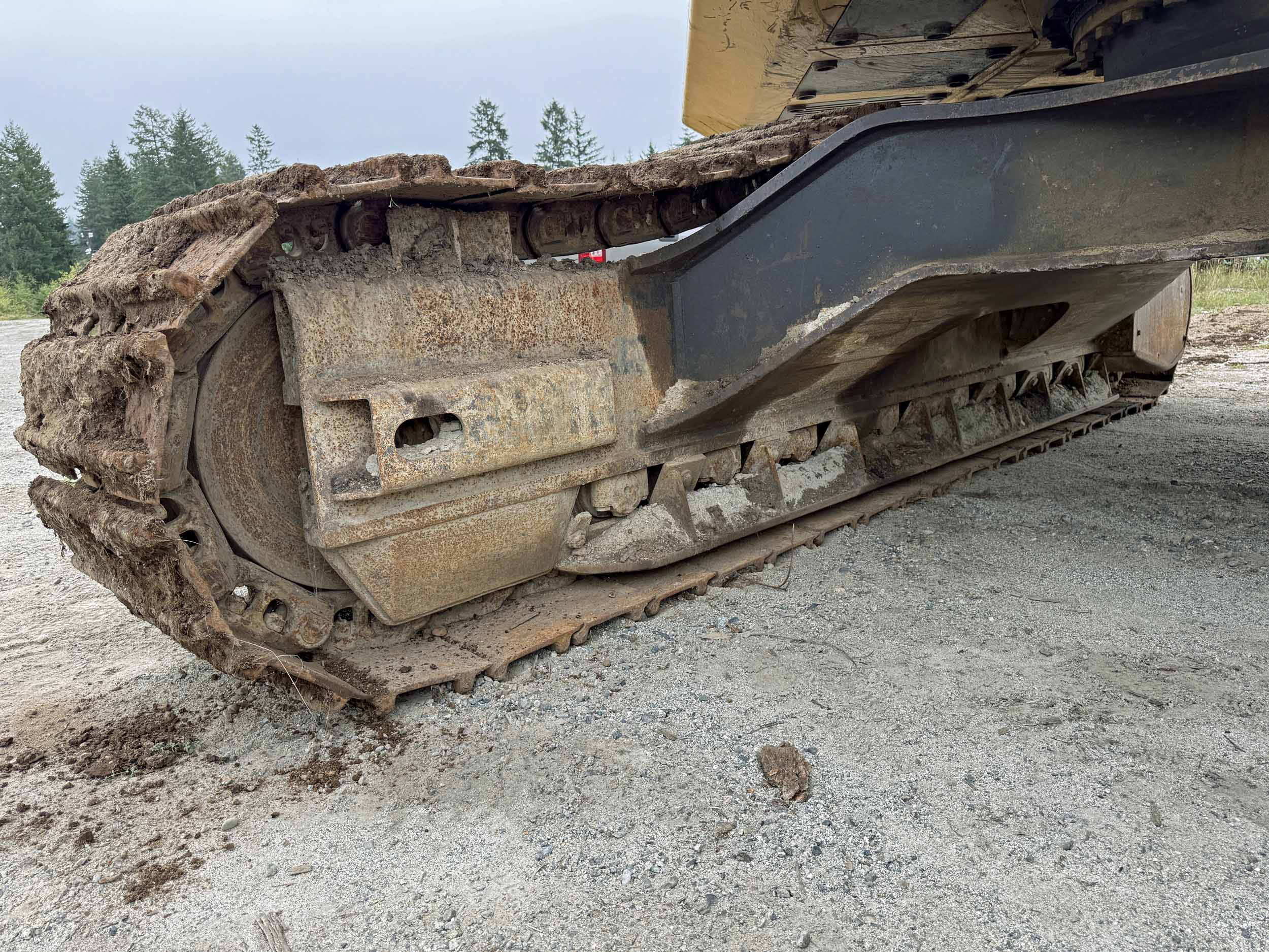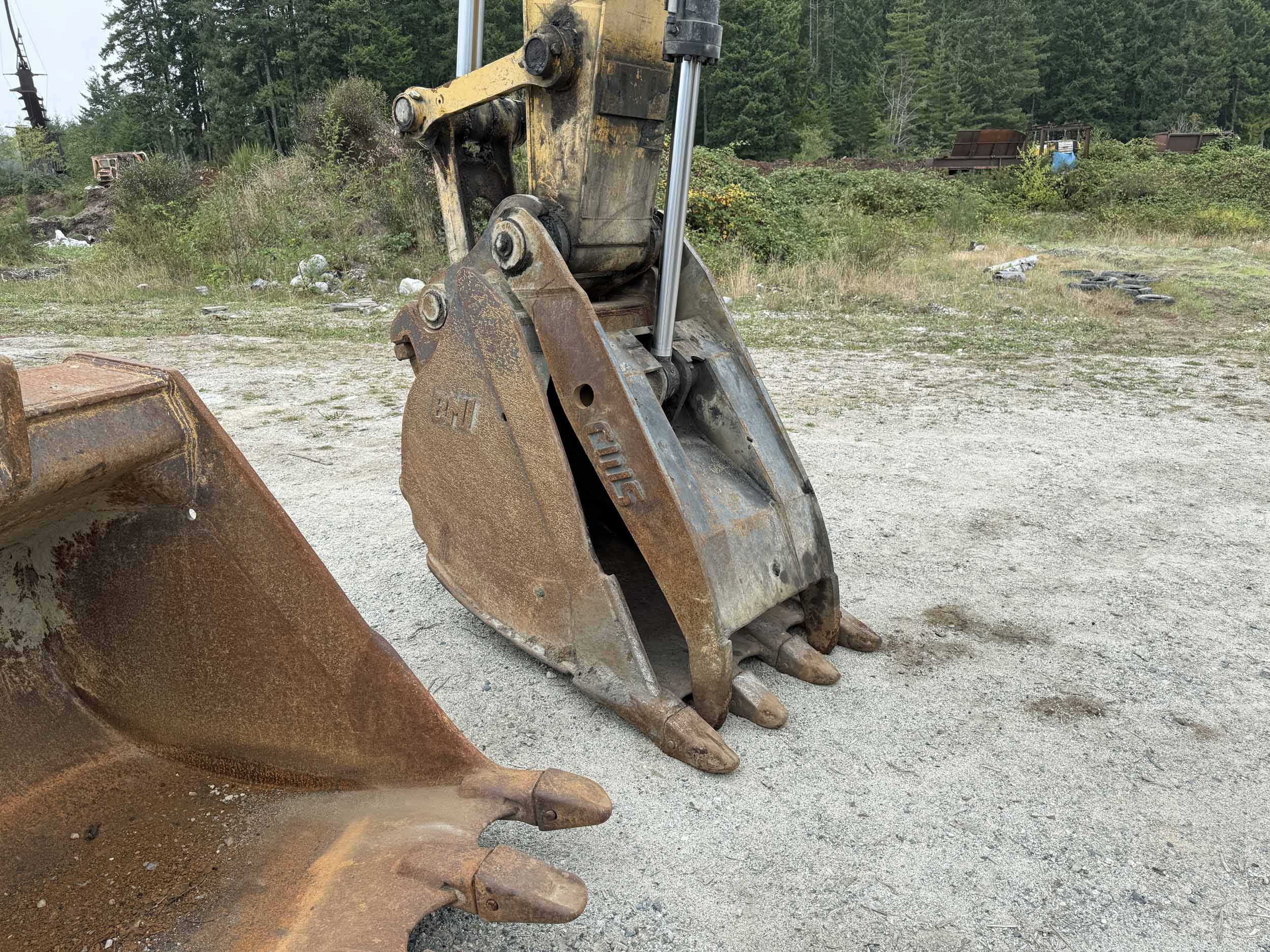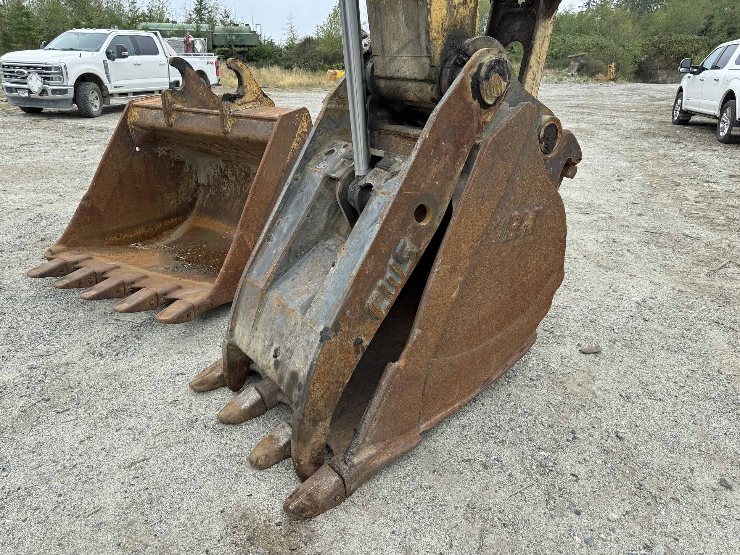 Equipped with 40” BMI dig bucket with four teeth, 64” CWS HD clean up bucket with six teeth, CWS manual quick coupler, CWS hydraulic thumb, hoe front, forestry cab on 8” riser, forestry guarding package, highwalker undercarriage with 28” double bar pads.
