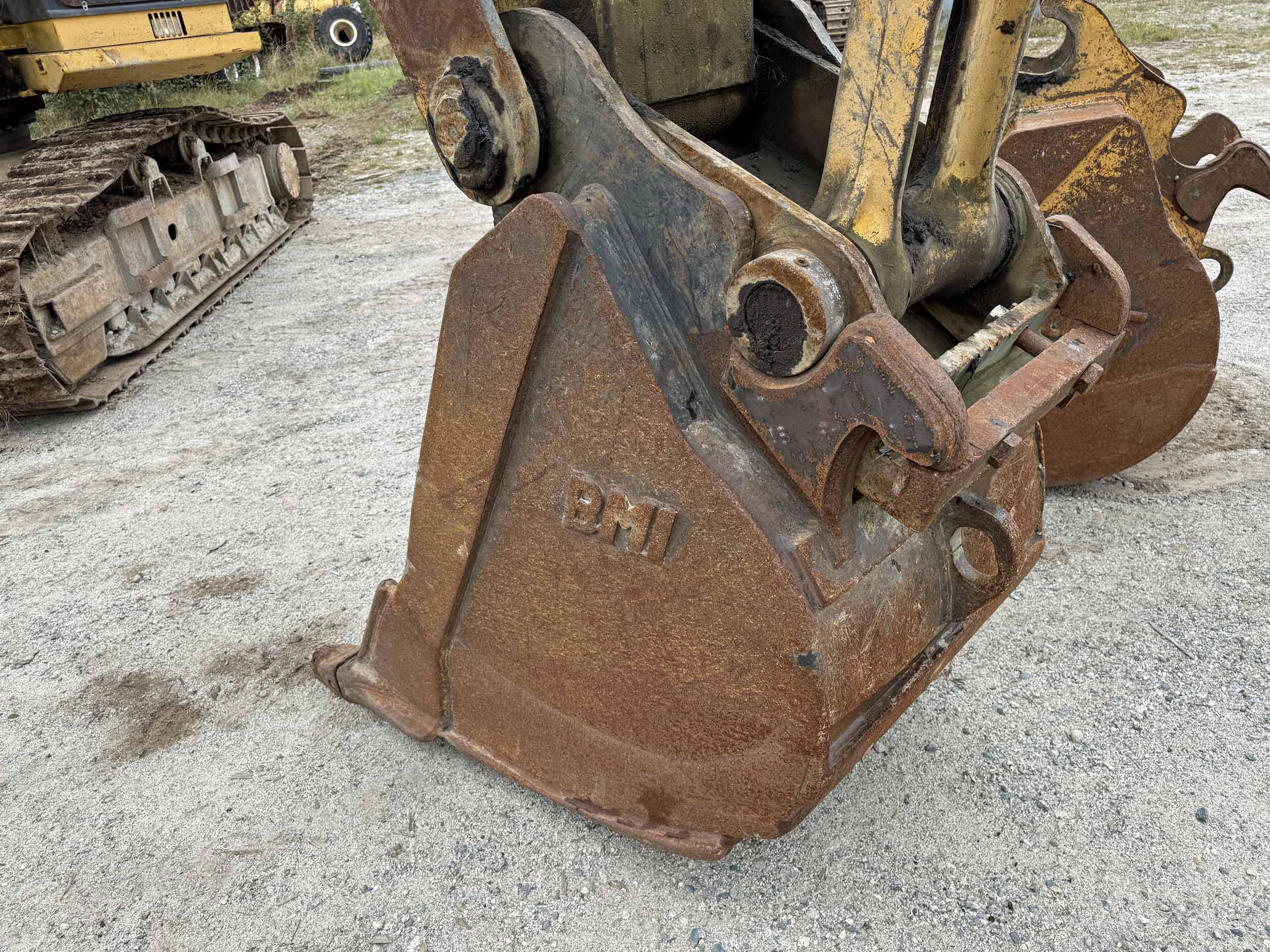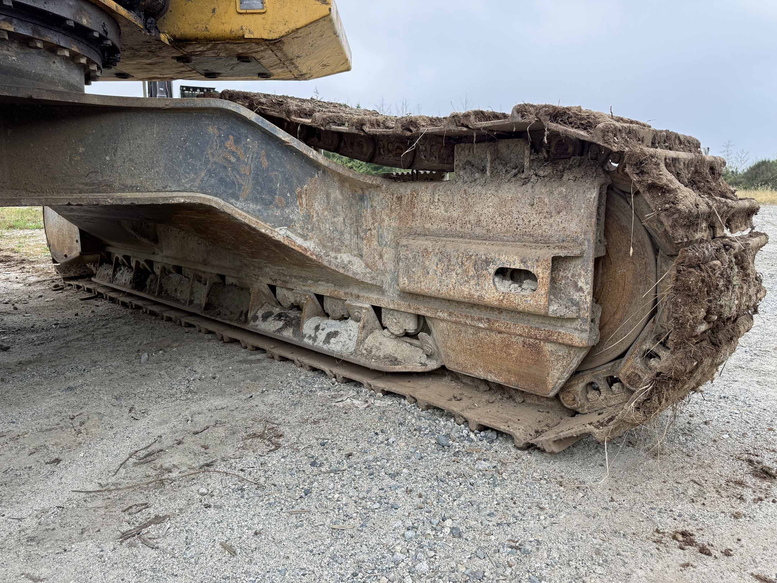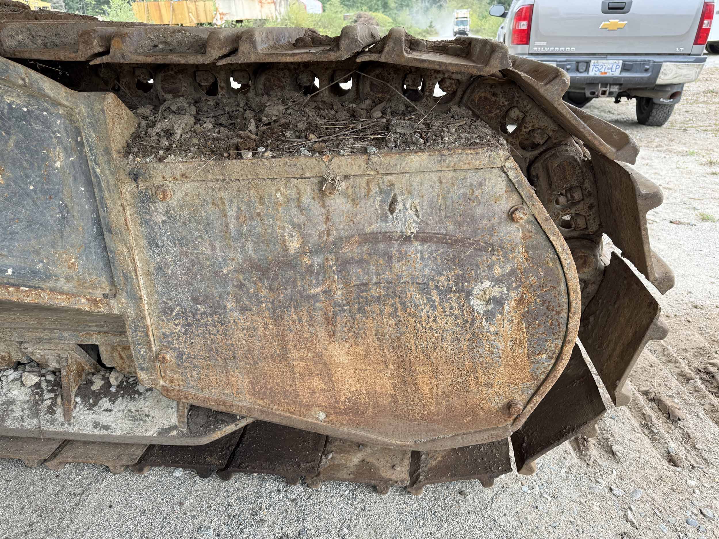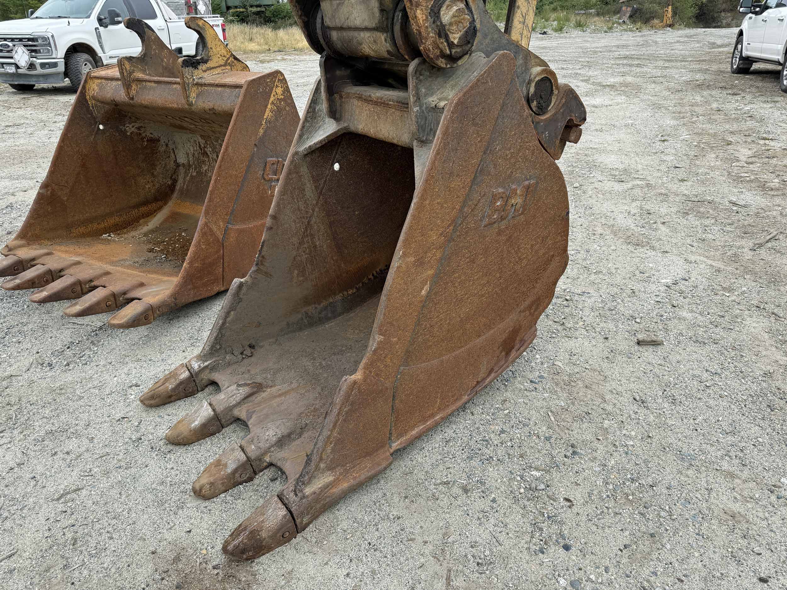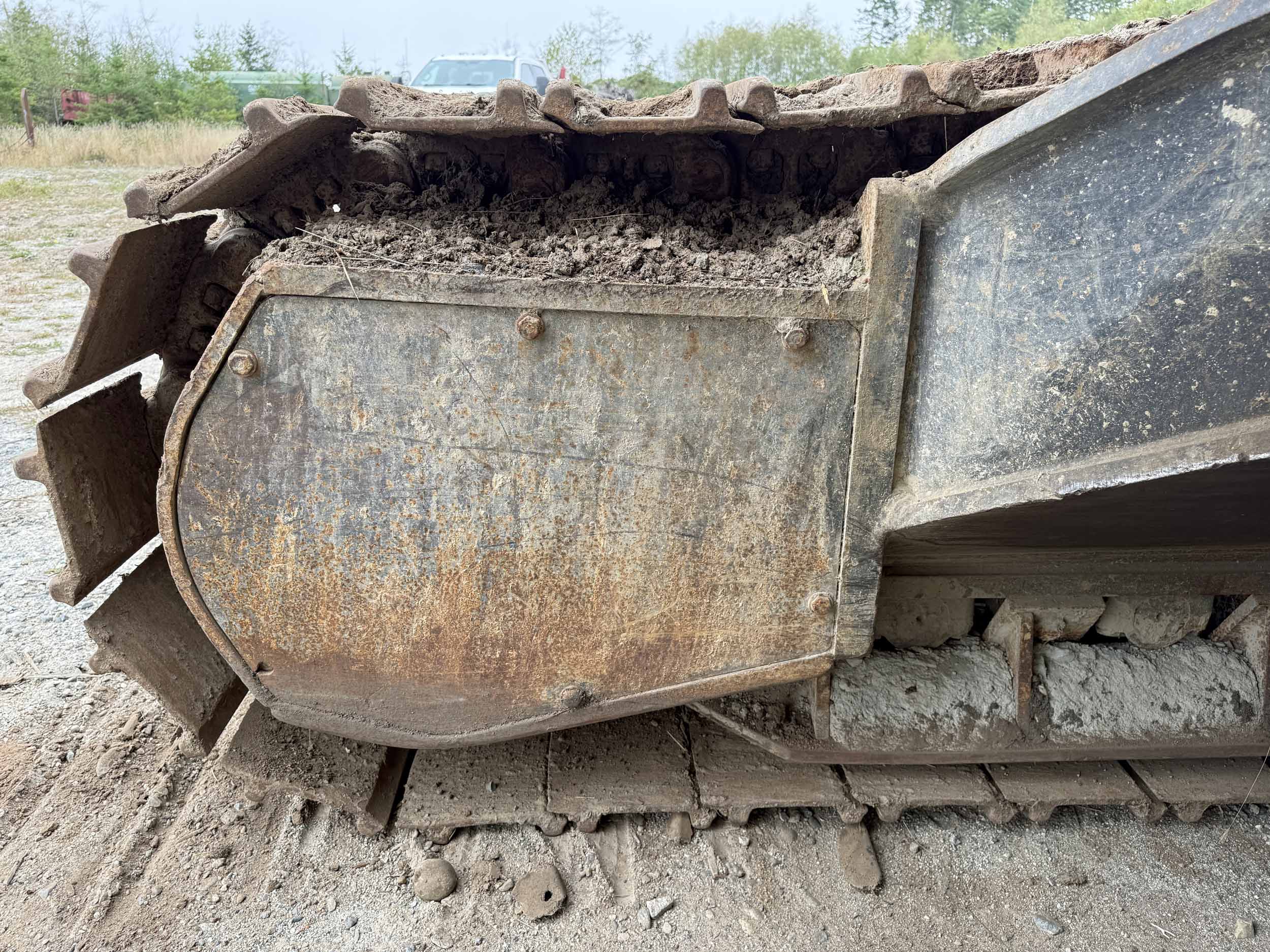 Equipped with 40” BMI dig bucket with four teeth, 64” CWS HD clean up bucket with six teeth, CWS manual quick coupler, CWS hydraulic thumb, hoe front, forestry cab on 8” riser, forestry guarding package, highwalker undercarriage with 28” double bar pads.