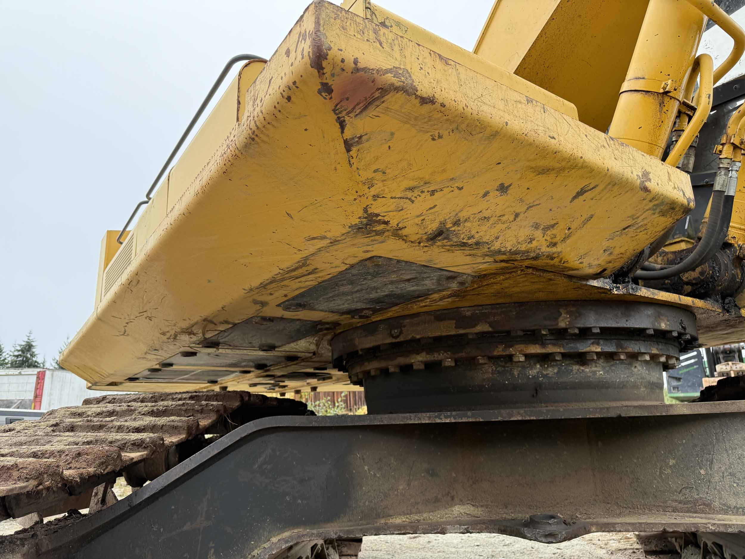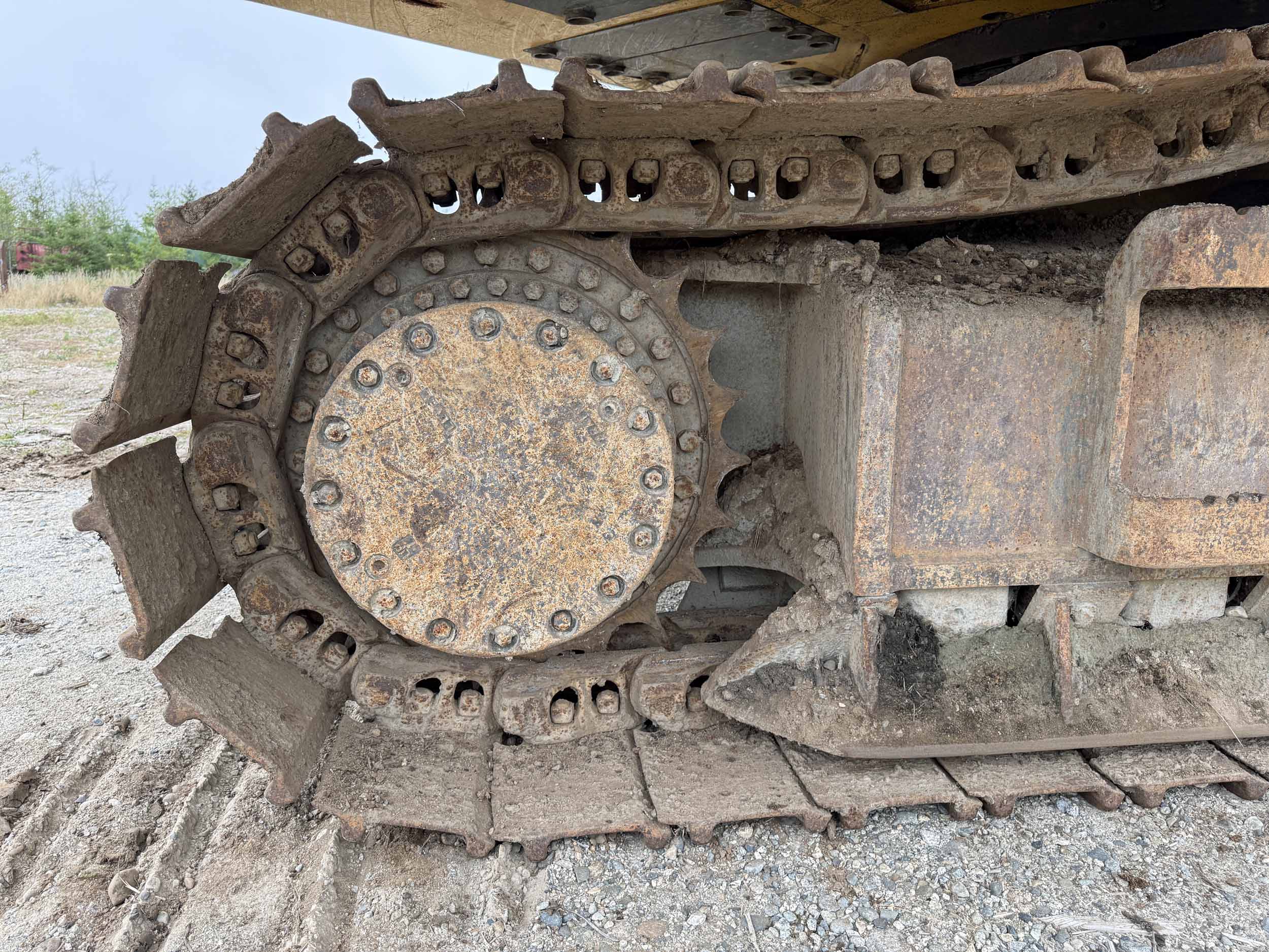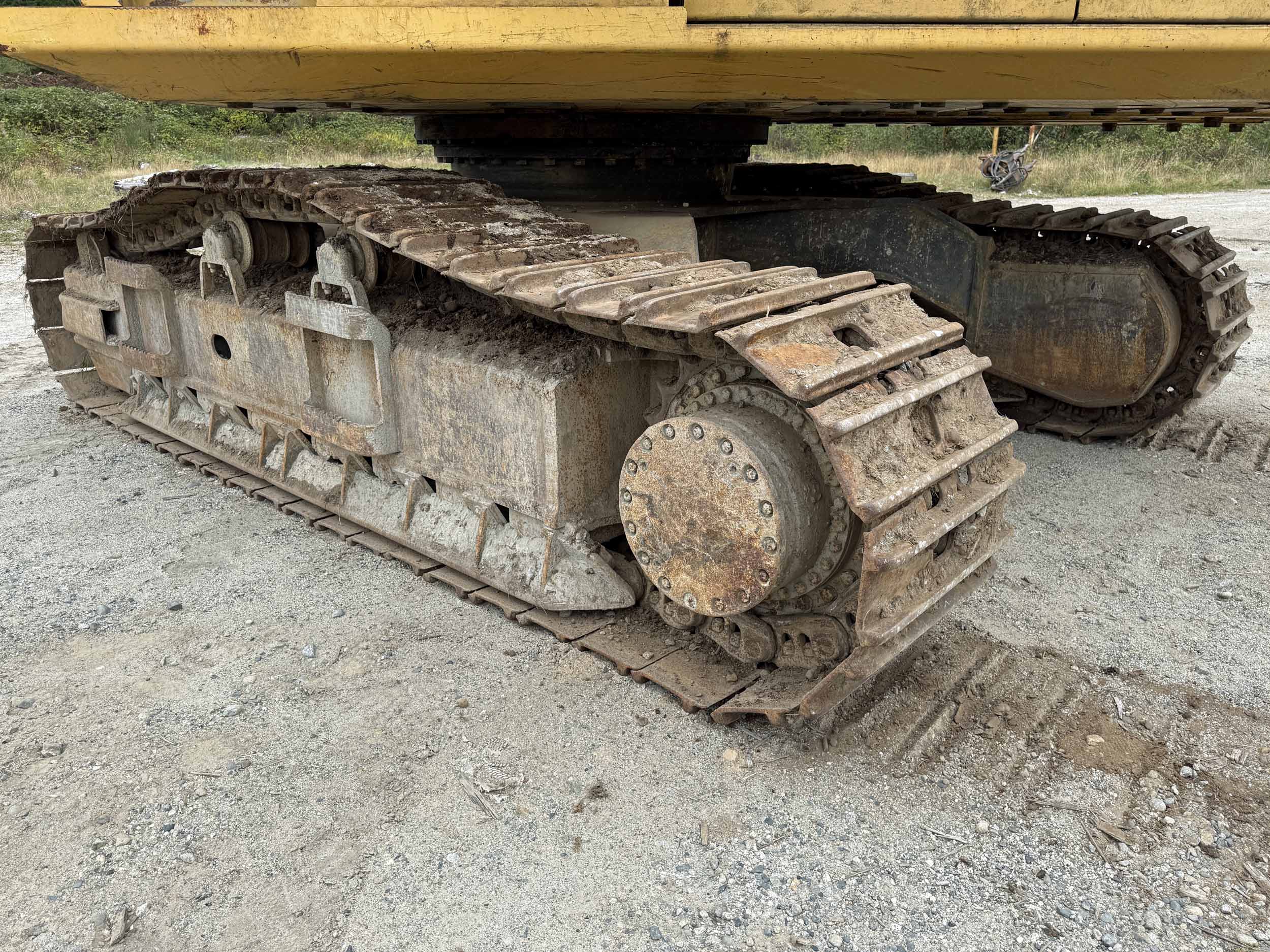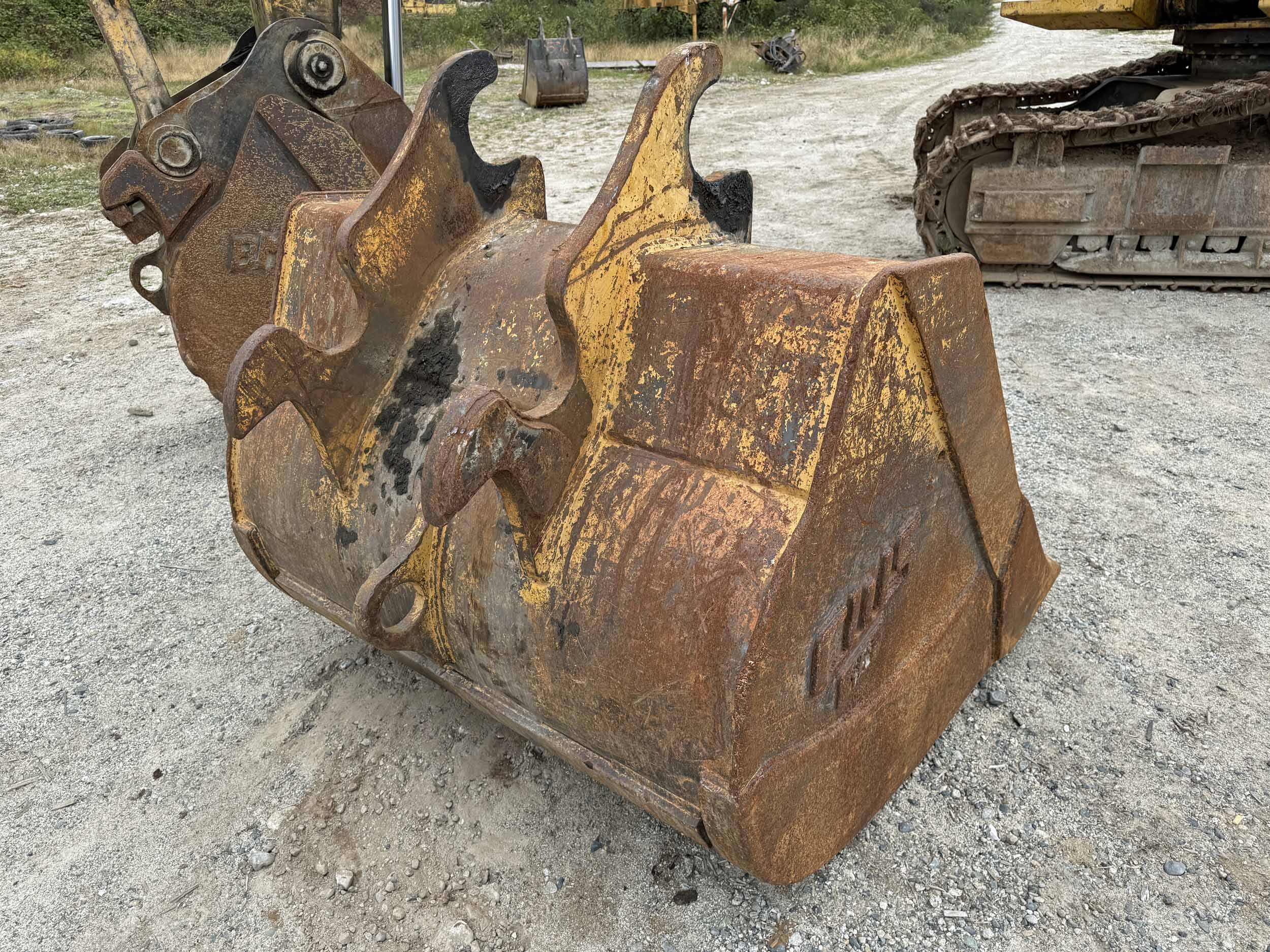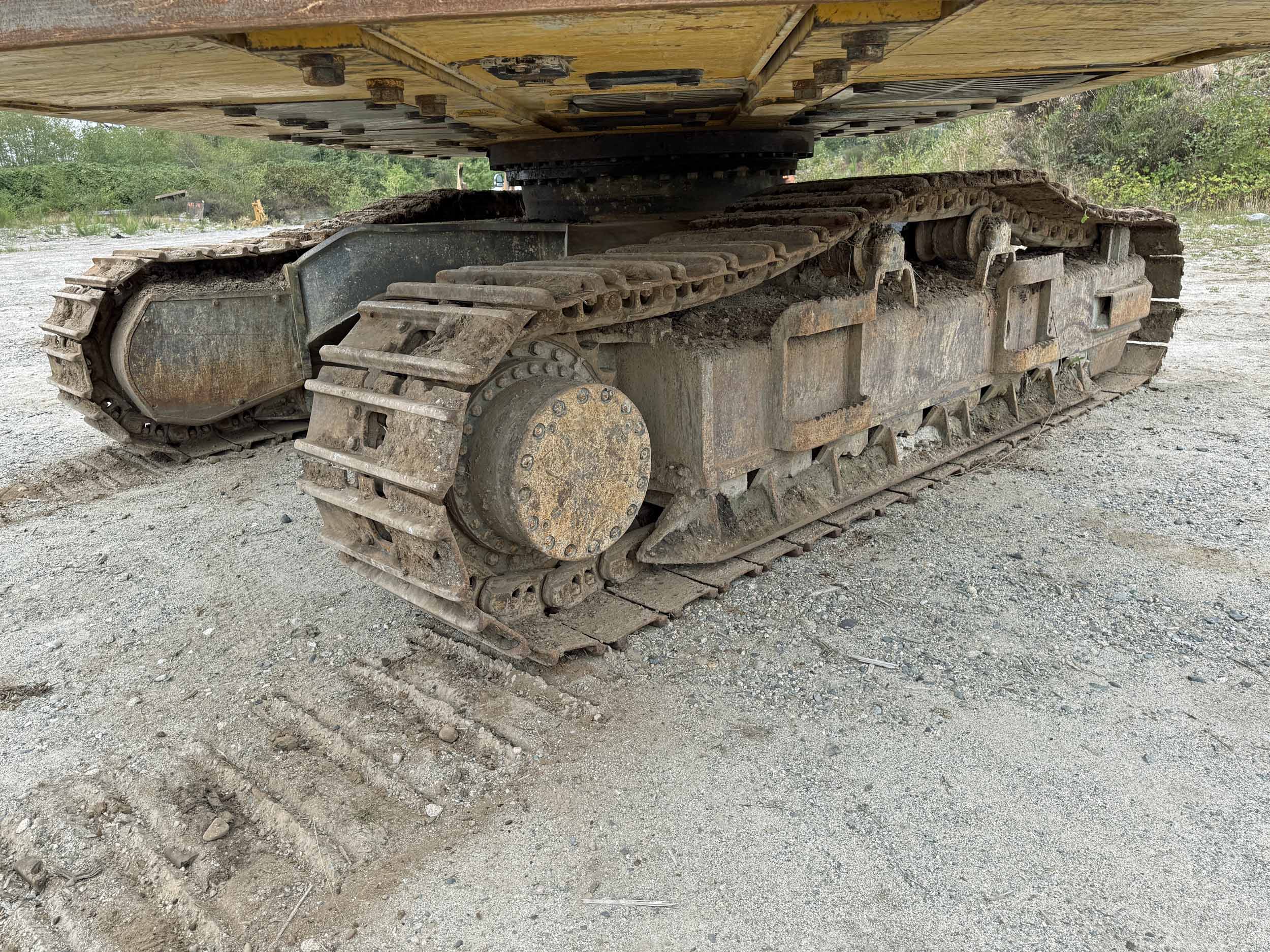 Equipped with 40” BMI dig bucket with four teeth, 64” CWS HD clean up bucket with six teeth, CWS manual quick coupler, CWS hydraulic thumb, hoe front, forestry cab on 8” riser, forestry guarding package, highwalker undercarriage with 28” double bar pads.