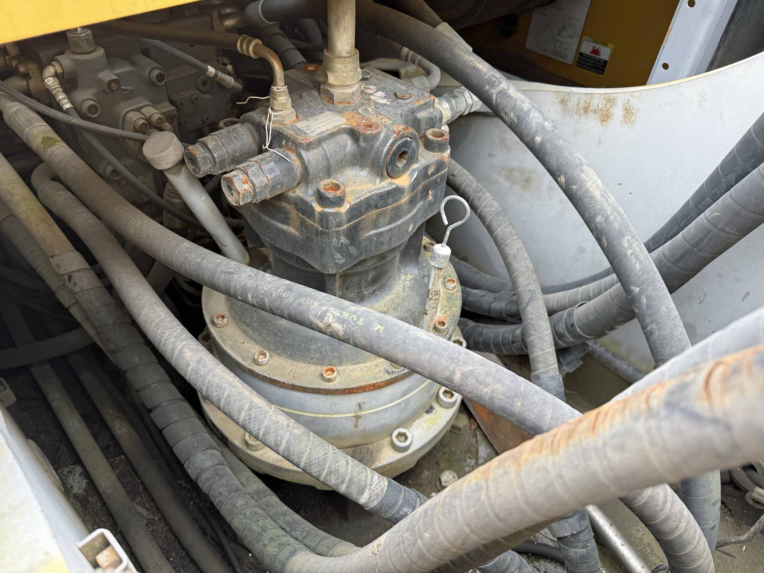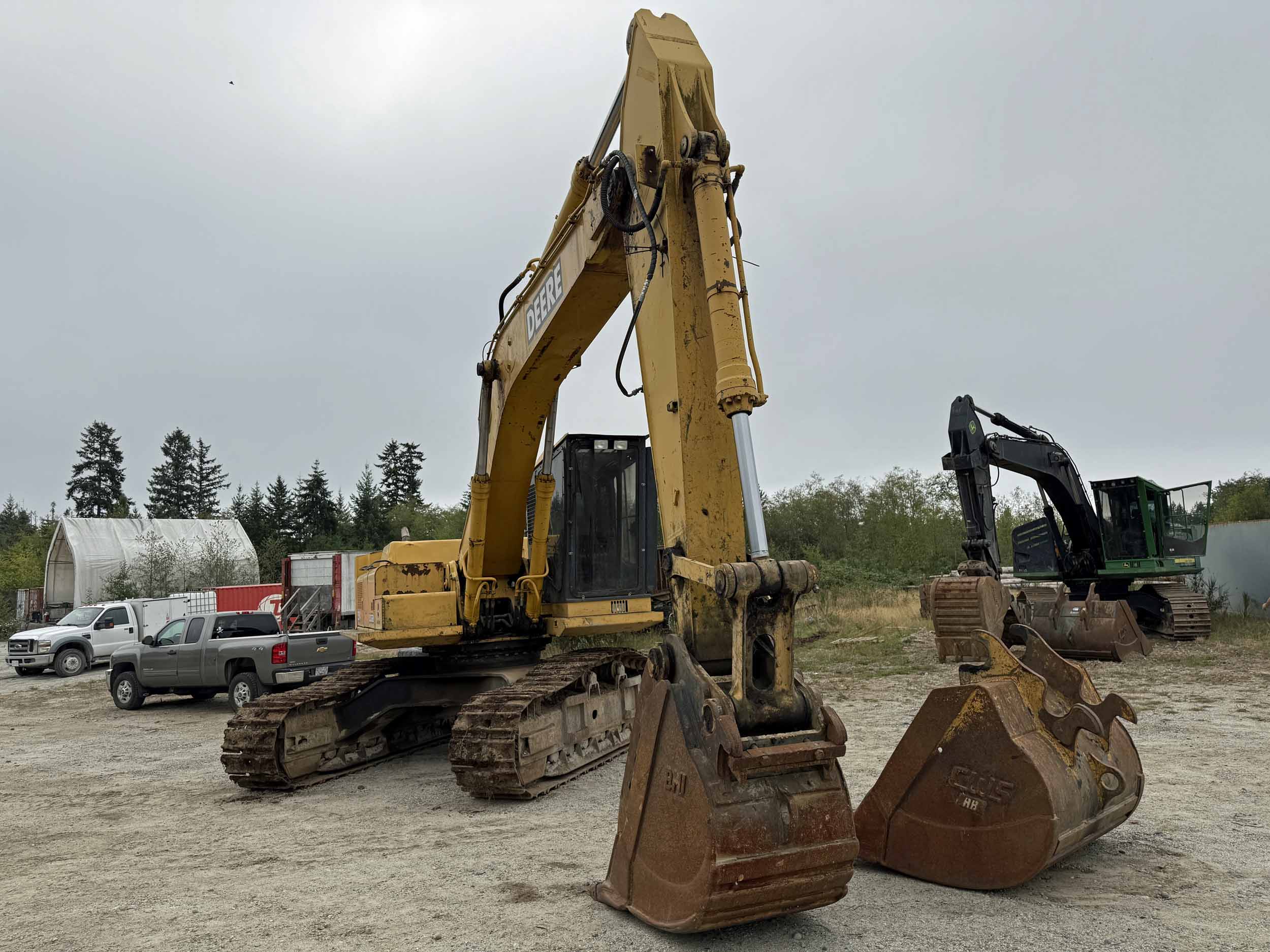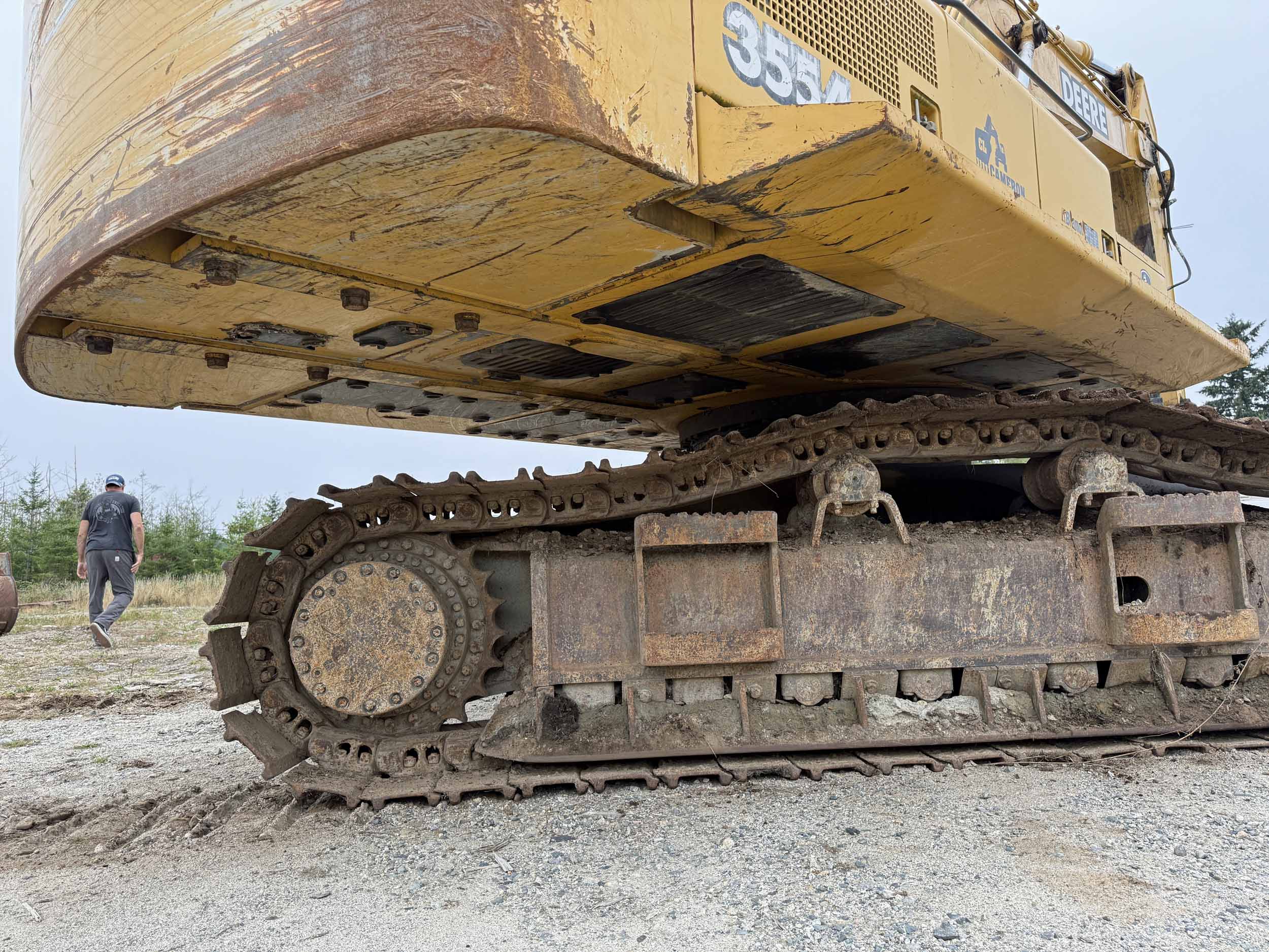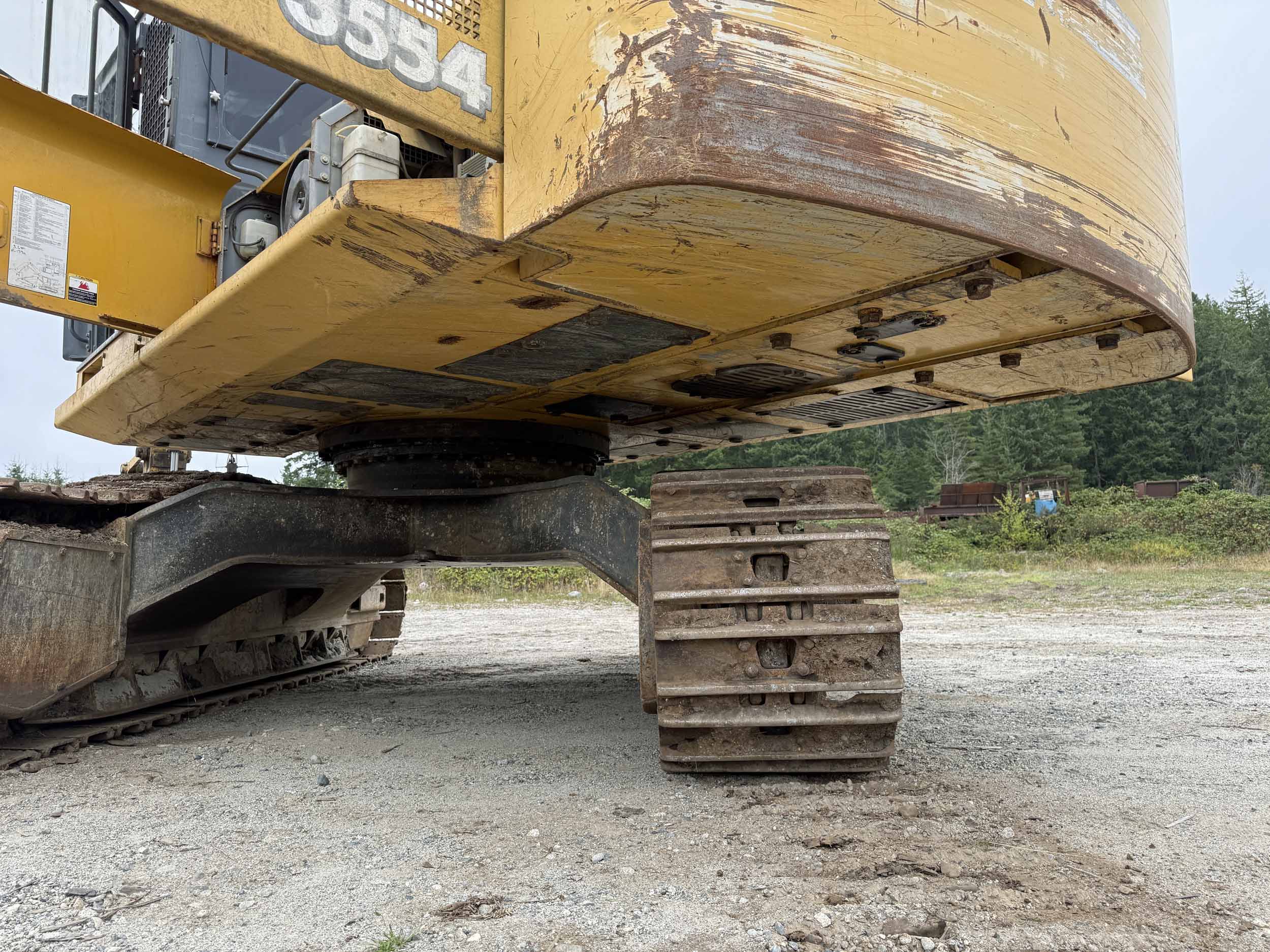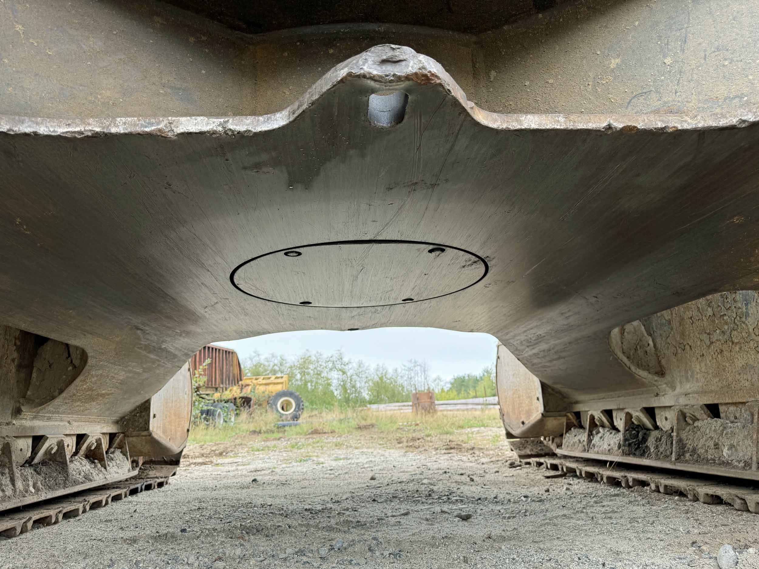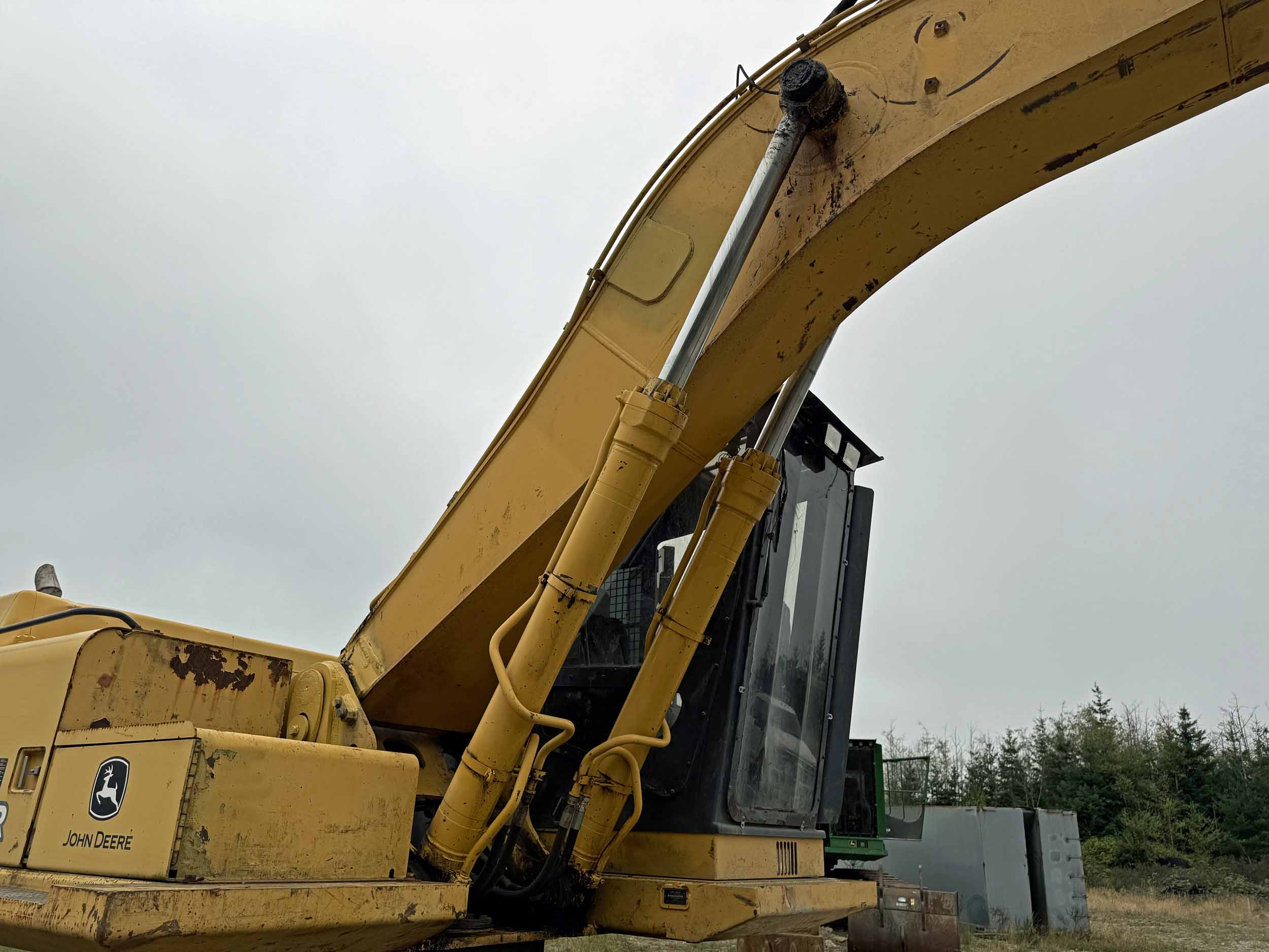Equipped with 40” BMI dig bucket with four teeth, 64” CWS HD clean up bucket with six teeth, CWS manual quick coupler, CWS hydraulic thumb, hoe front, forestry cab on 8” riser, forestry guarding package, highwalker undercarriage with 28” double bar pads.