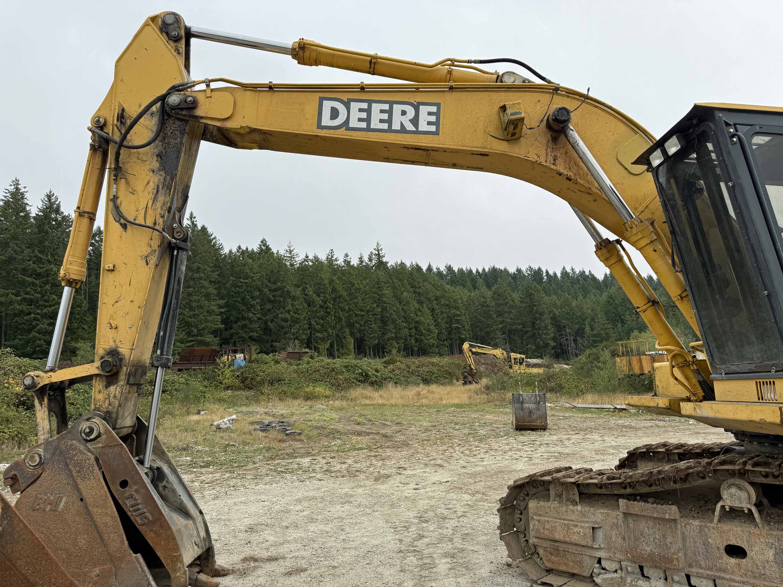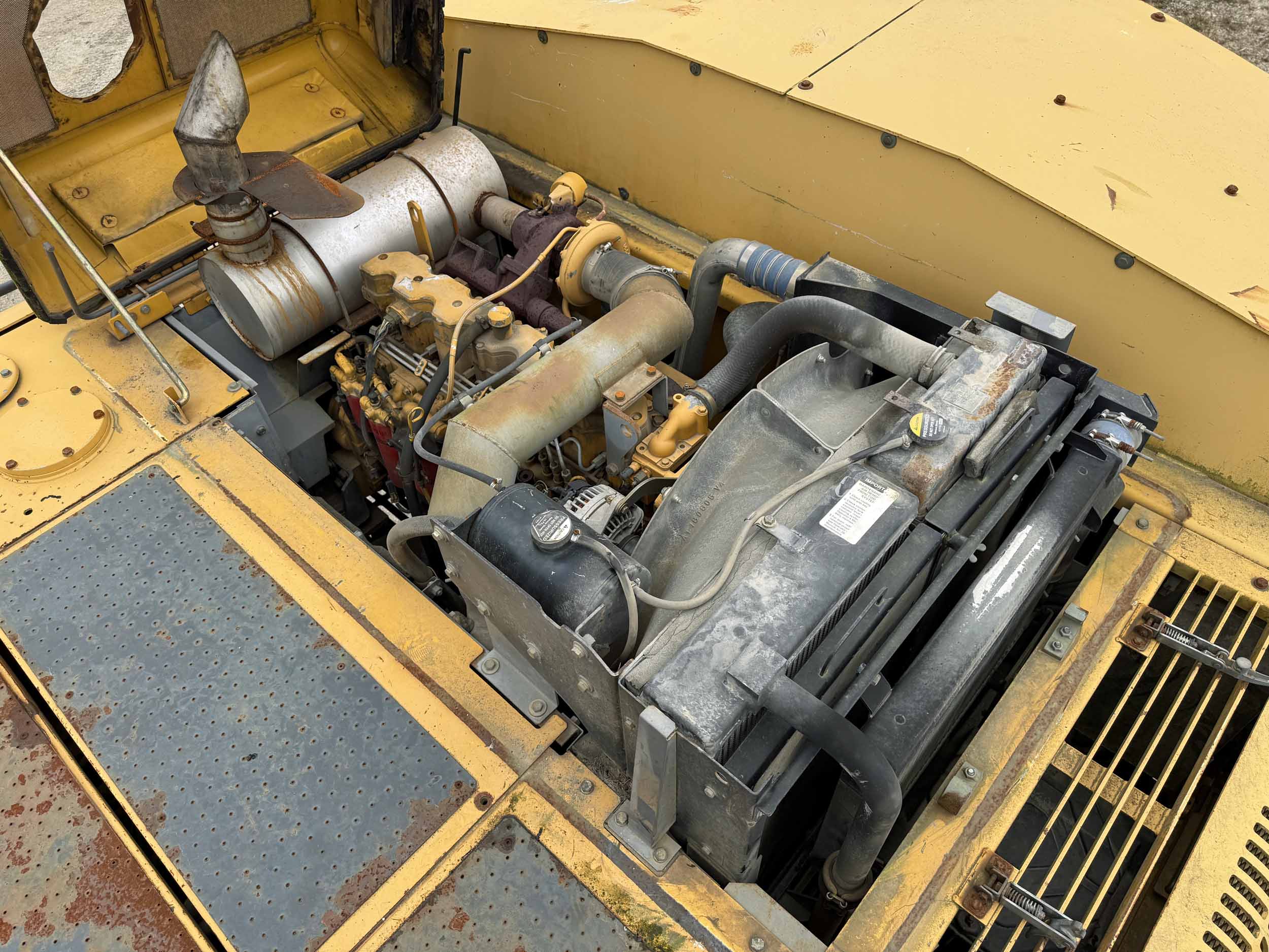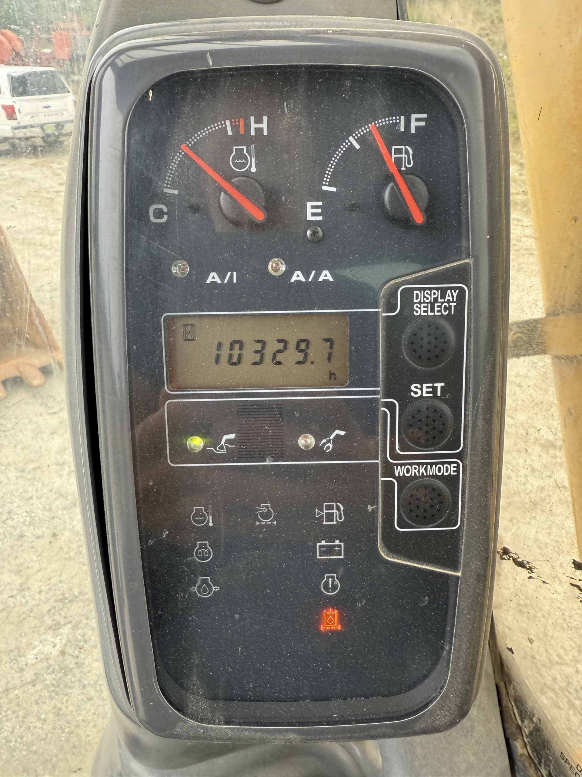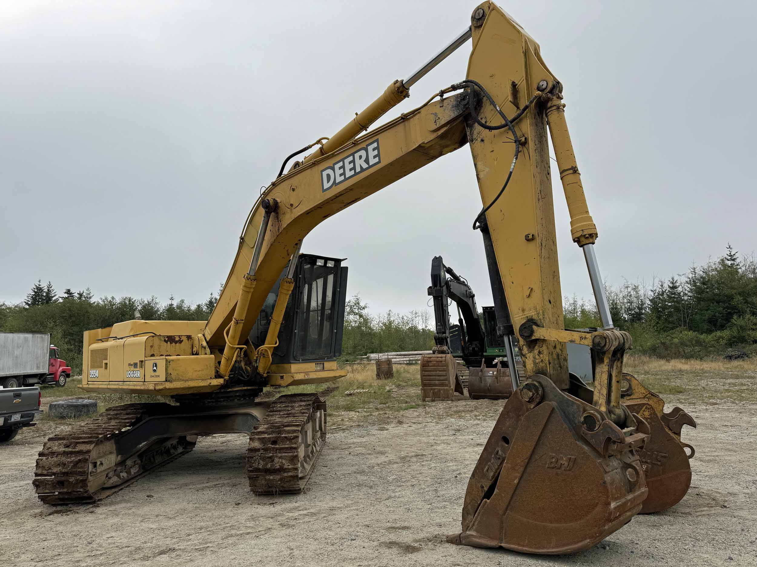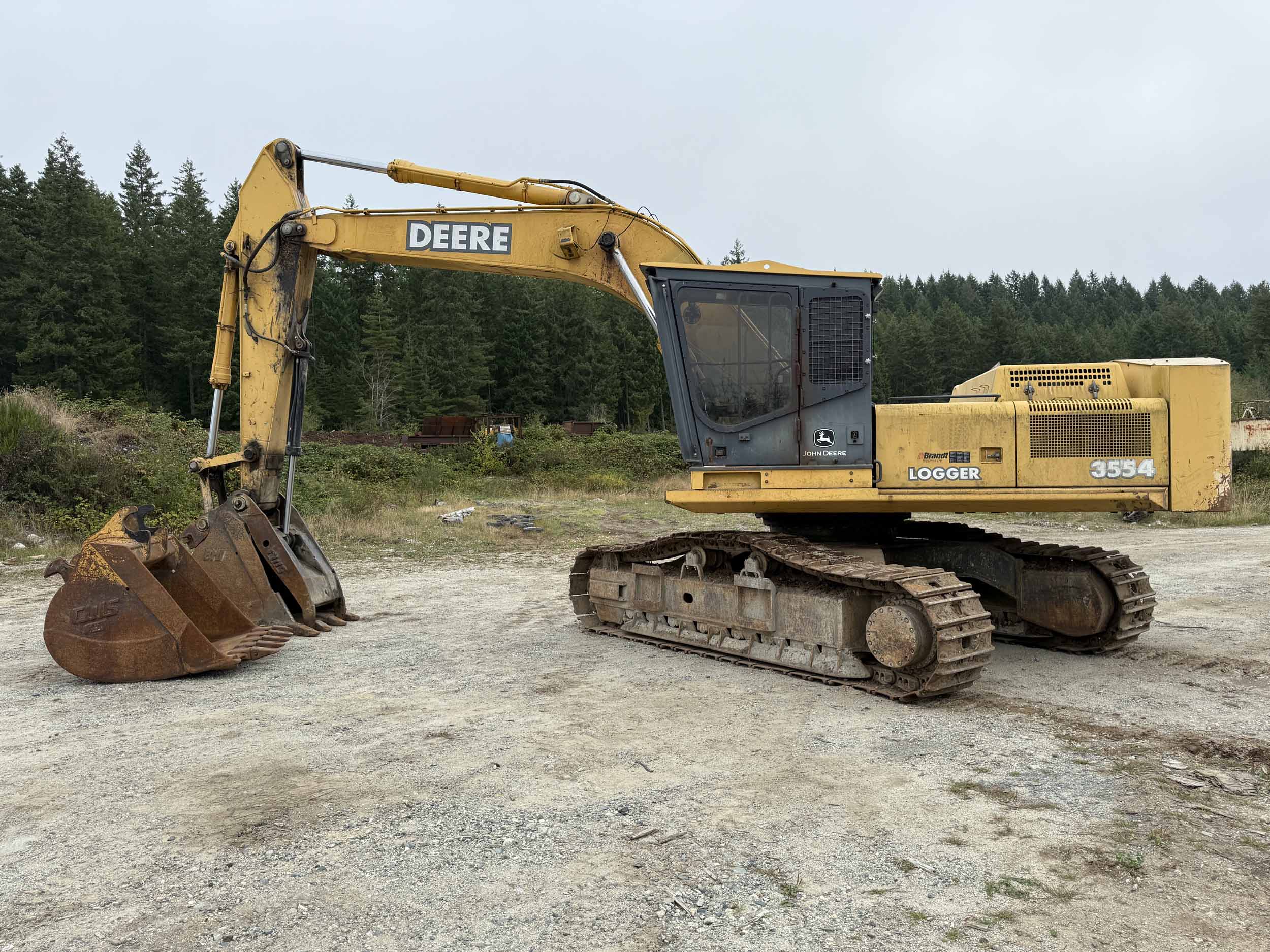 Equipped with 40” BMI dig bucket with four teeth, 64” CWS HD clean up bucket with six teeth, CWS manual quick coupler, CWS hydraulic thumb, hoe front, forestry cab on 8” riser, forestry guarding package, highwalker undercarriage with 28” double bar pads.