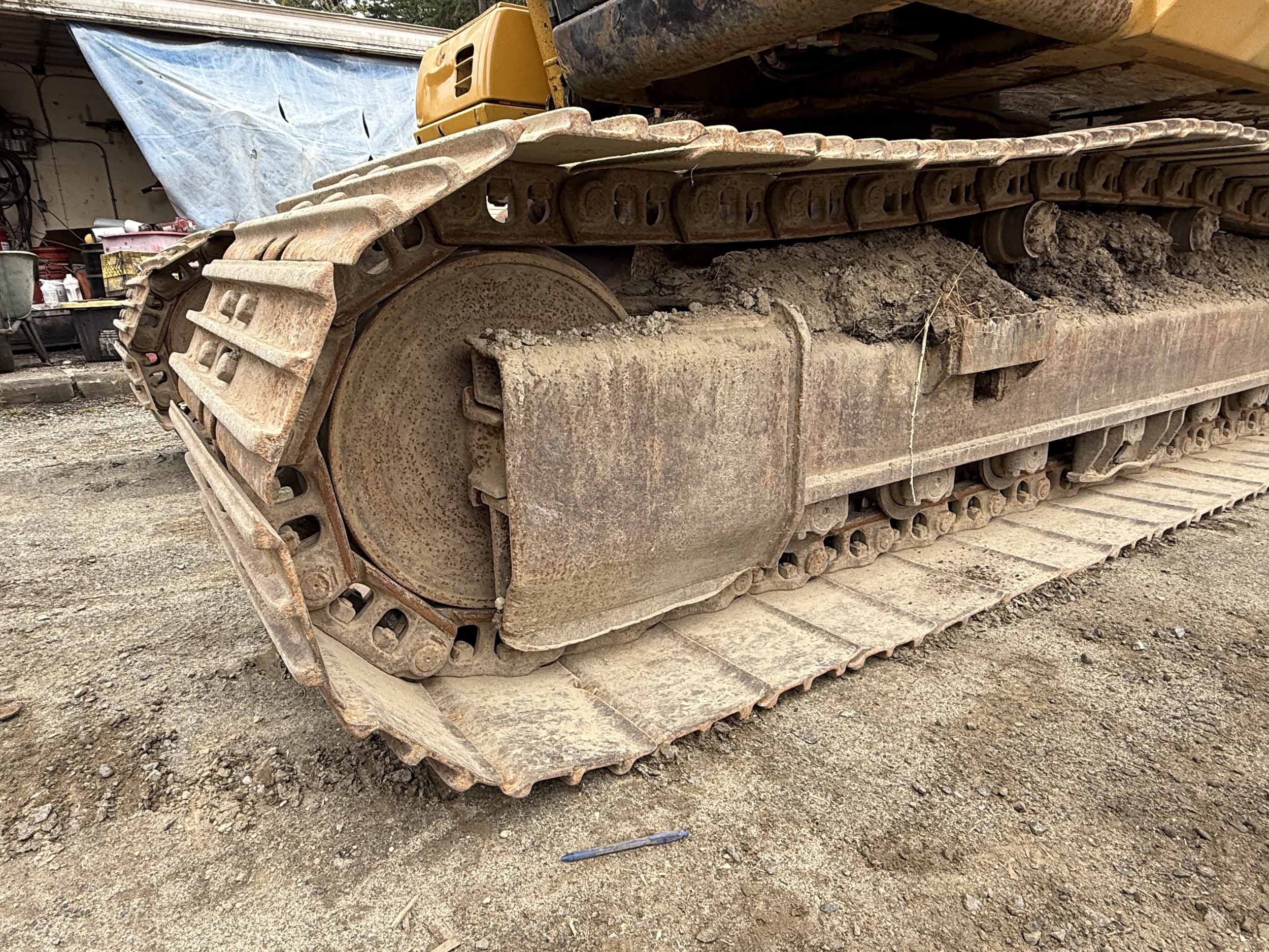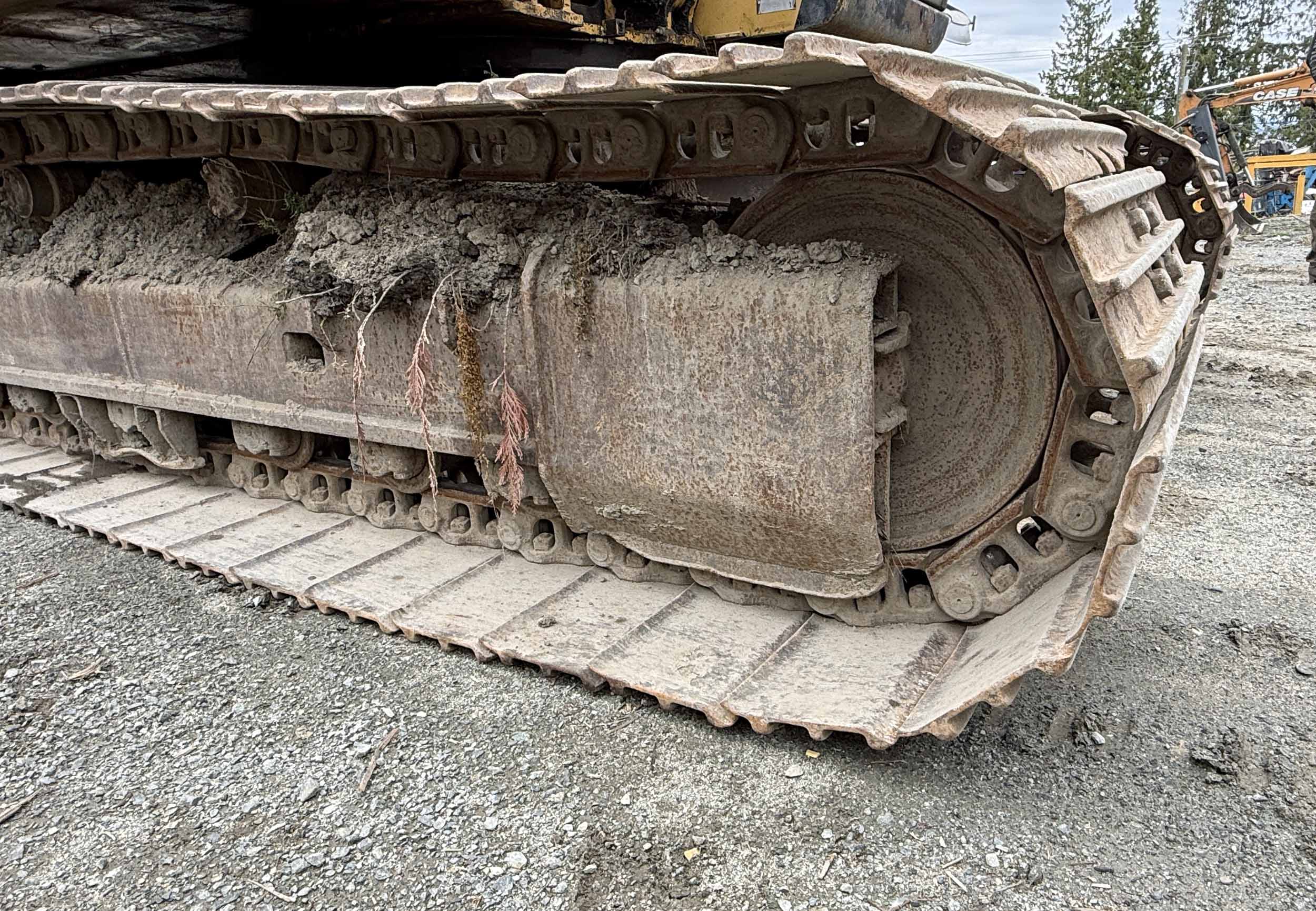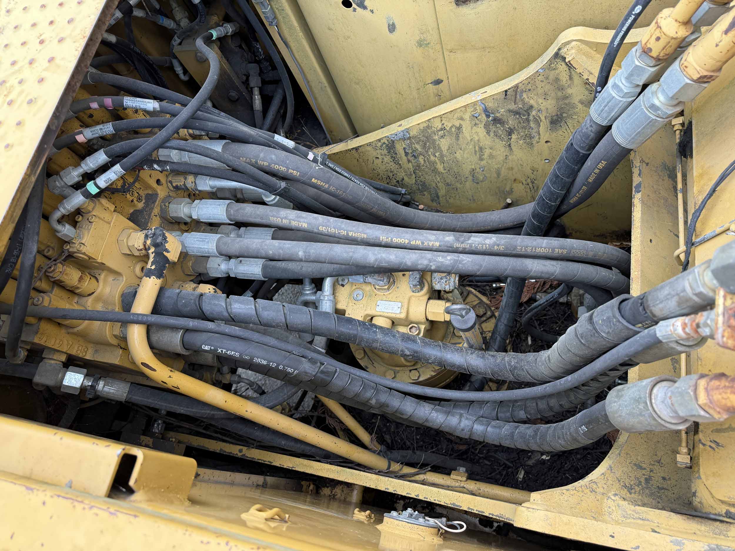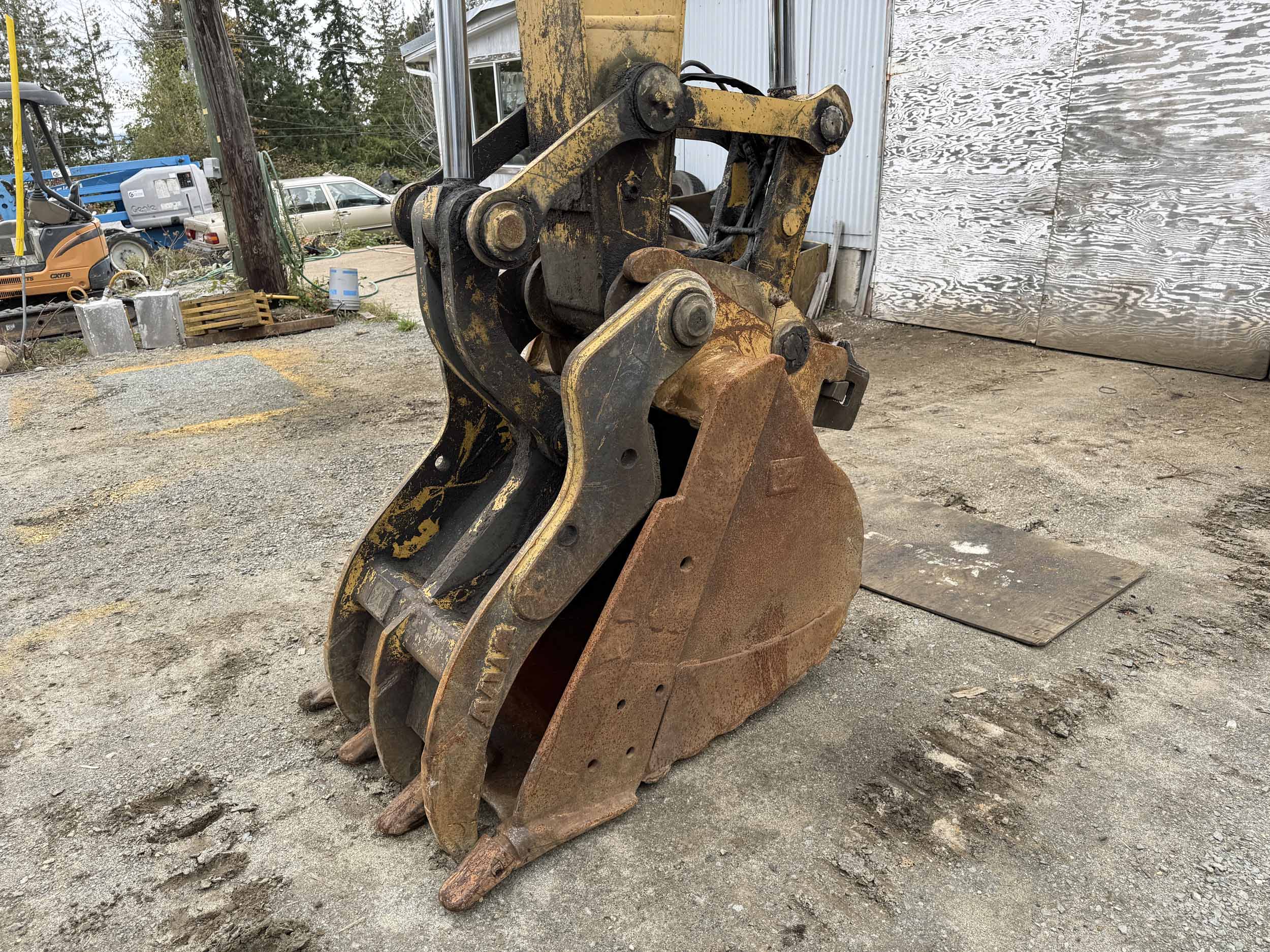 Equipped with Caterpillar 34”‘dig bucket with four teeth, clean up bucket, Caterpillar hydraulic quick coupler, Daequip pro link hydraulic thumb, 123” stick, hoe boom, cab, standard undercarriage with 28” triple bar pads.