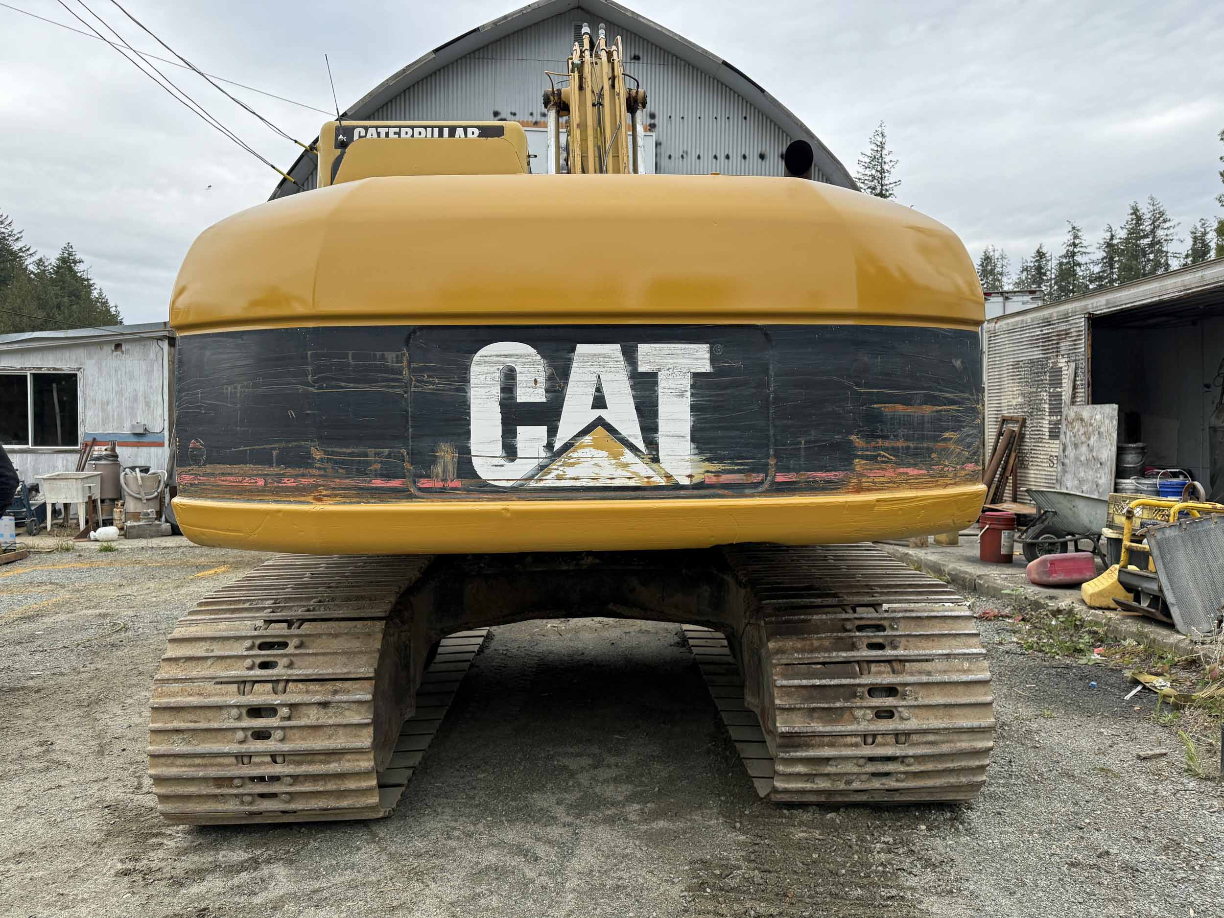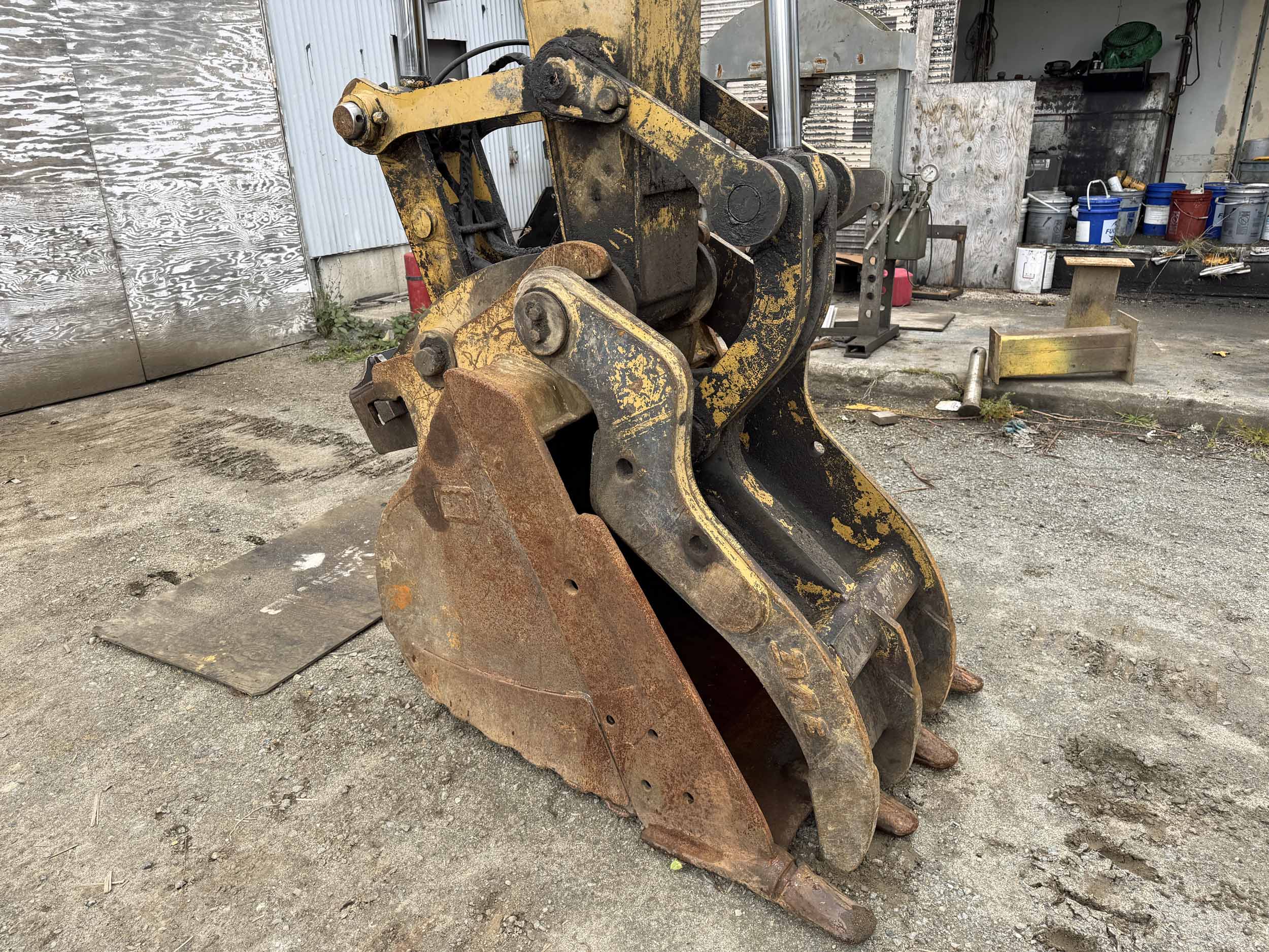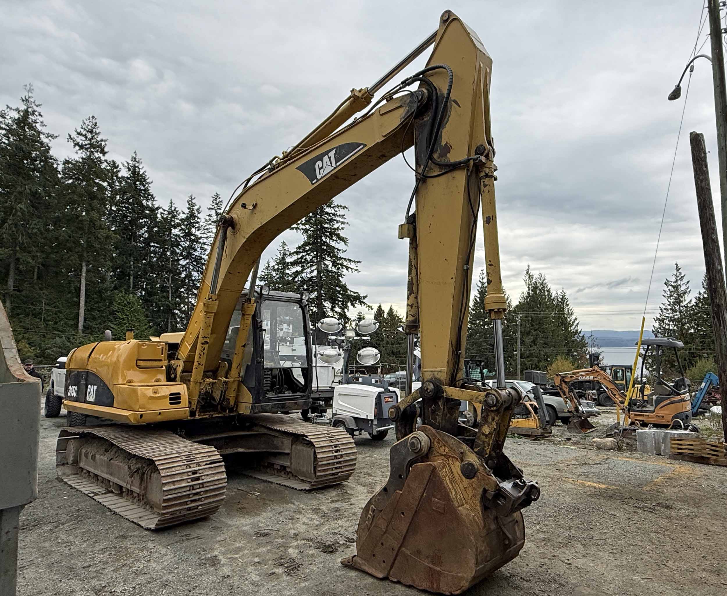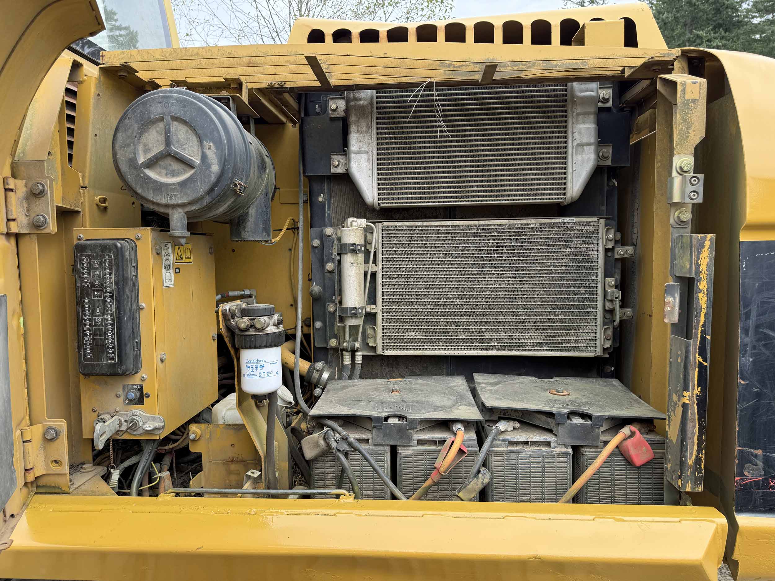 Equipped with Caterpillar 34”‘dig bucket with four teeth, clean up bucket, Caterpillar hydraulic quick coupler, Daequip pro link hydraulic thumb, 123” stick, hoe boom, cab, standard undercarriage with 28” triple bar pads.